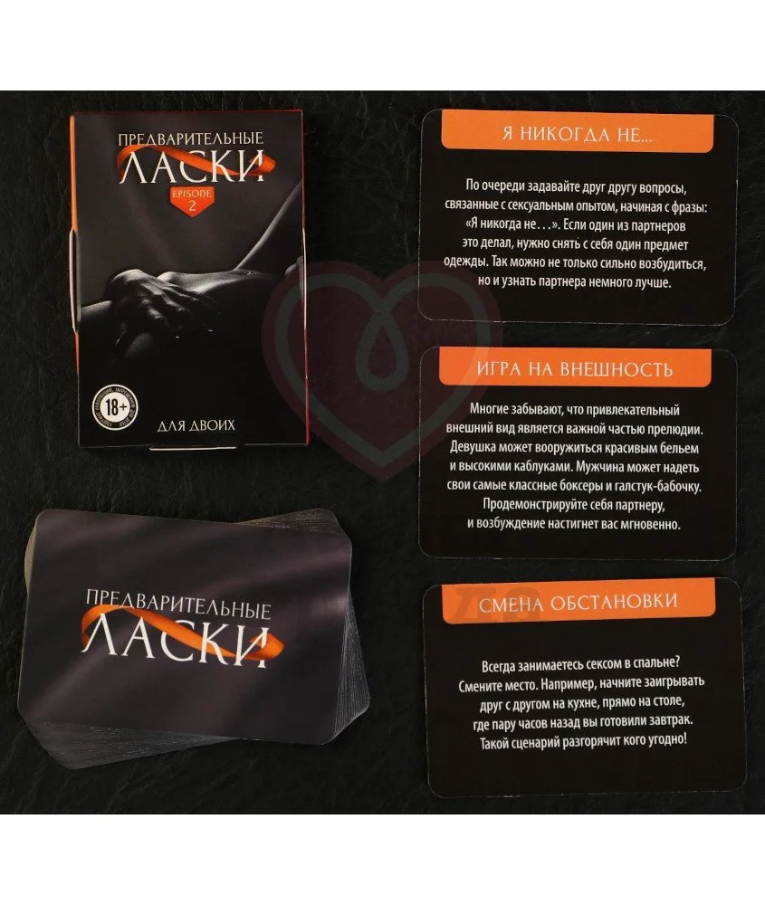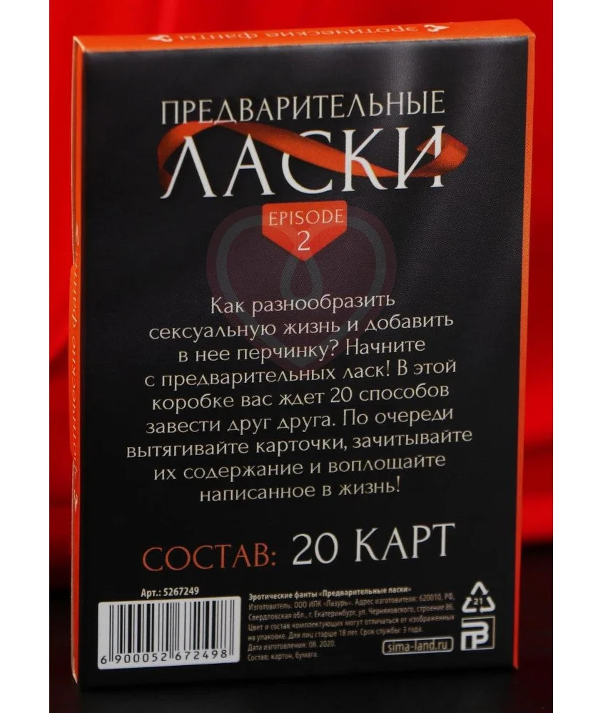 Фанты «Предварительные ласки» помогут вам обновить ваши отношения, если захотелось новых ощущений и впечатлений. В наборе 20 карточек с эротическими заданиями для чувственных и запоминающихся прелюдий. Хотите сделать вашему партнеру приятное особенным способом? Узнать о вашей половинке что-нибудь интересное или пикантное? Вытягивайте карточки и выполняйте необычные задания по соблазнению друг друга. В наборе: 20 карточек с фантами