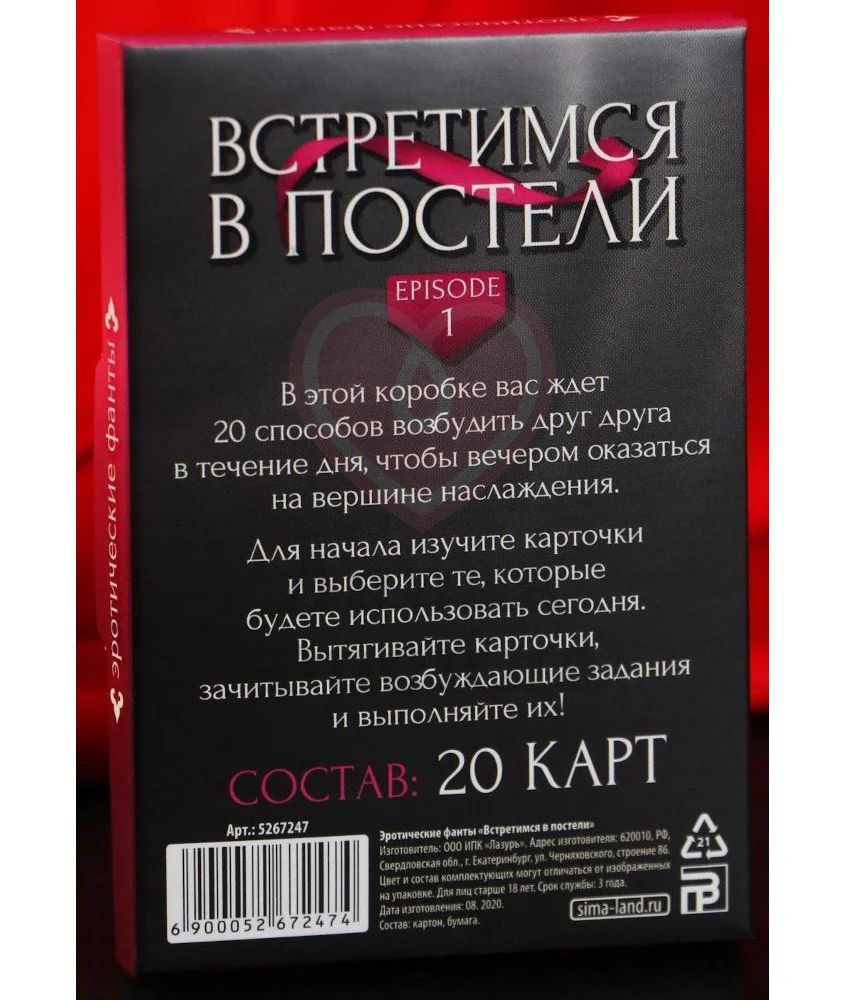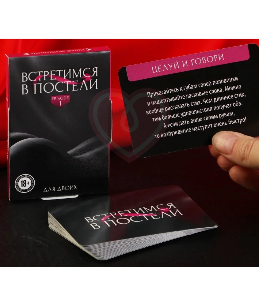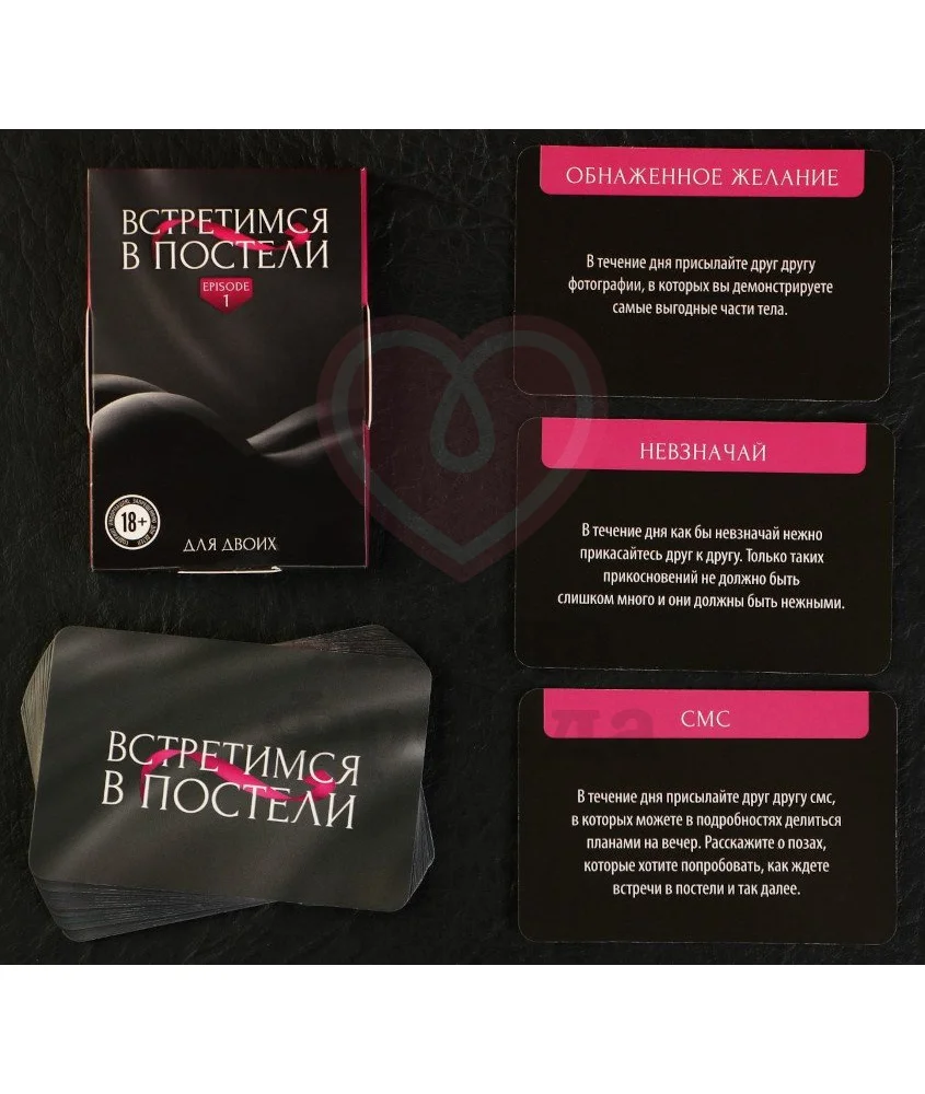 Фанты для влюбленной пары "Встретимся в постели" предлагают серию простых заданий, которые нужно выполнять в течение дня, чтобы вечером испытывать к друг другу максимальное влечение. В наборе находятся 20 карточек с фантами: вытяните одну из них, чтобы определить ваше задание на сегодня. Игра посоветует, как вам заигрывать с партнером, создавая ощущение непреодолимого желания: дразните друг друга, чтобы потом насладиться страстной близостью. Состав: 20 карточек
