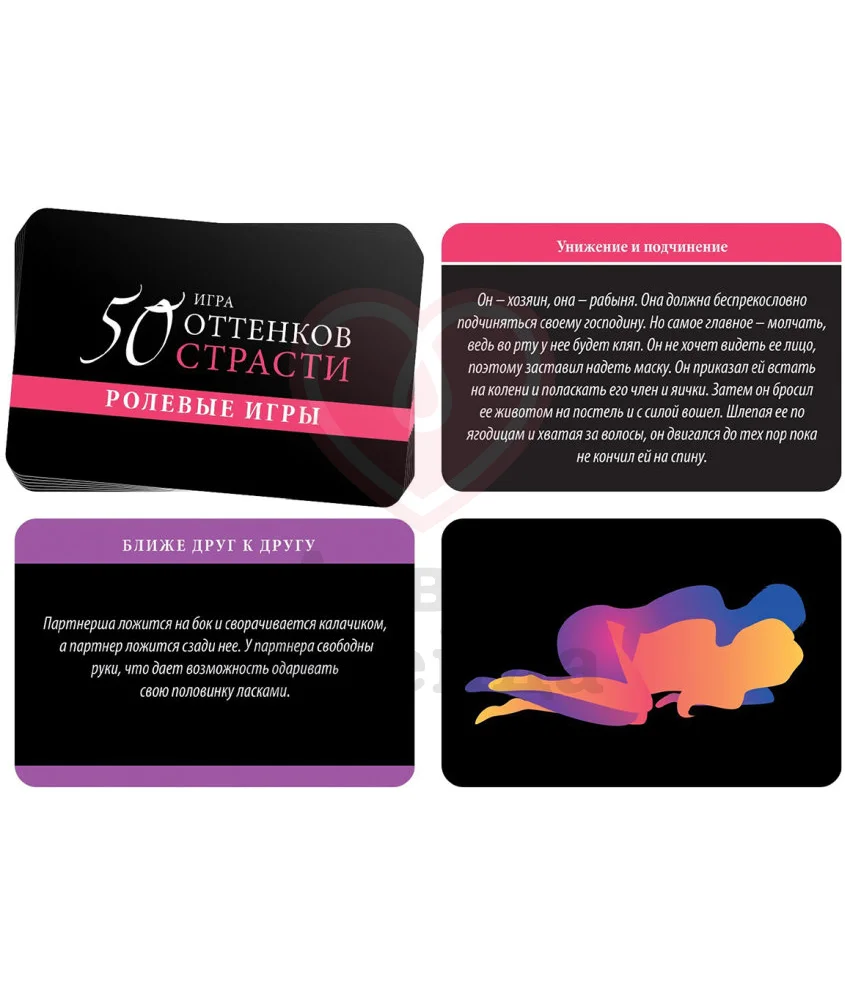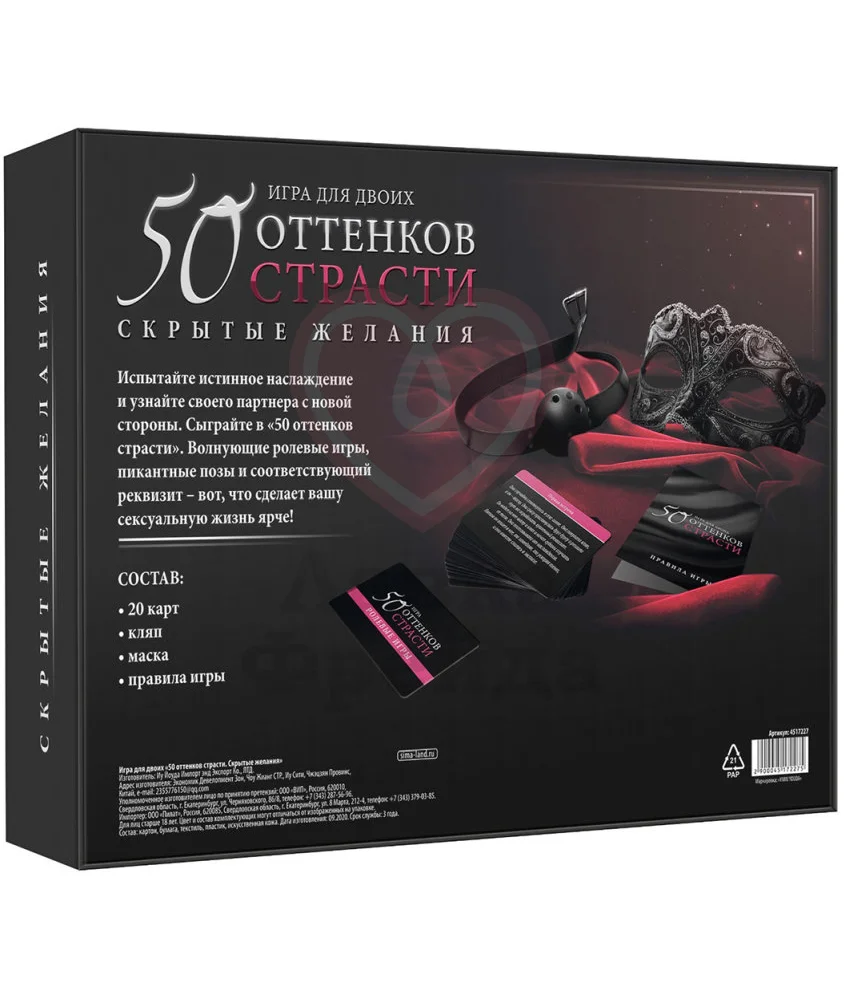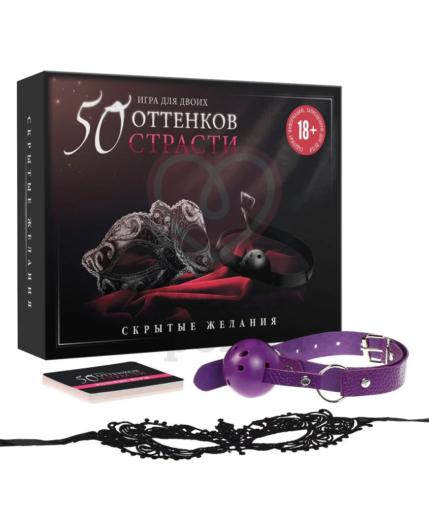 В игре для двоих «50 оттенков страсти. Скрытые желания» вы примерите на себя новые роли, а также попробуете классные секс-практики с использованием маски и кляпа. В наборе находятся 20 карточек с особыми эротическими заданиями двух типов: колода «Ролевые игры» предложит разыграть сценарий из ваших самых смелых фантазий, а колода «Позы» подскажет, как именно вы займетесь любовью. Некоторые карты предлагают также попробовать нечто особенное: перевоплотиться в коварных соблазнителей при маски или же лишить вашего партнера возможности говорить, воспользовавшись кляпом. Тяните по карточке из каждой колоды, выполняйте необходимы условия и получайте массу удовольствия, наслаждаясь близостью с партнером.