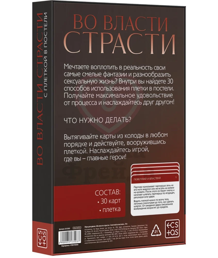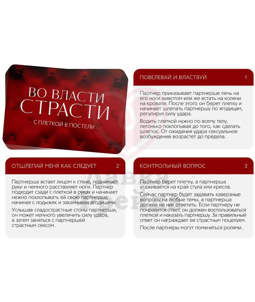 Привнесите в ваш вечер новый опыт - использование плётки. С помощью этой игры вы сможете побывать в роли госпожи или служанки, провинившегося садовника или хозяина особняка: на карточках указаны роли, которые вы сможете на себя примерить. Все игры включают в себя взаимодействие с плёткой, которая идёт в комплекте. Игра поможет раскрыть вас с неожиданной стороны и весело провести время с партнёром.