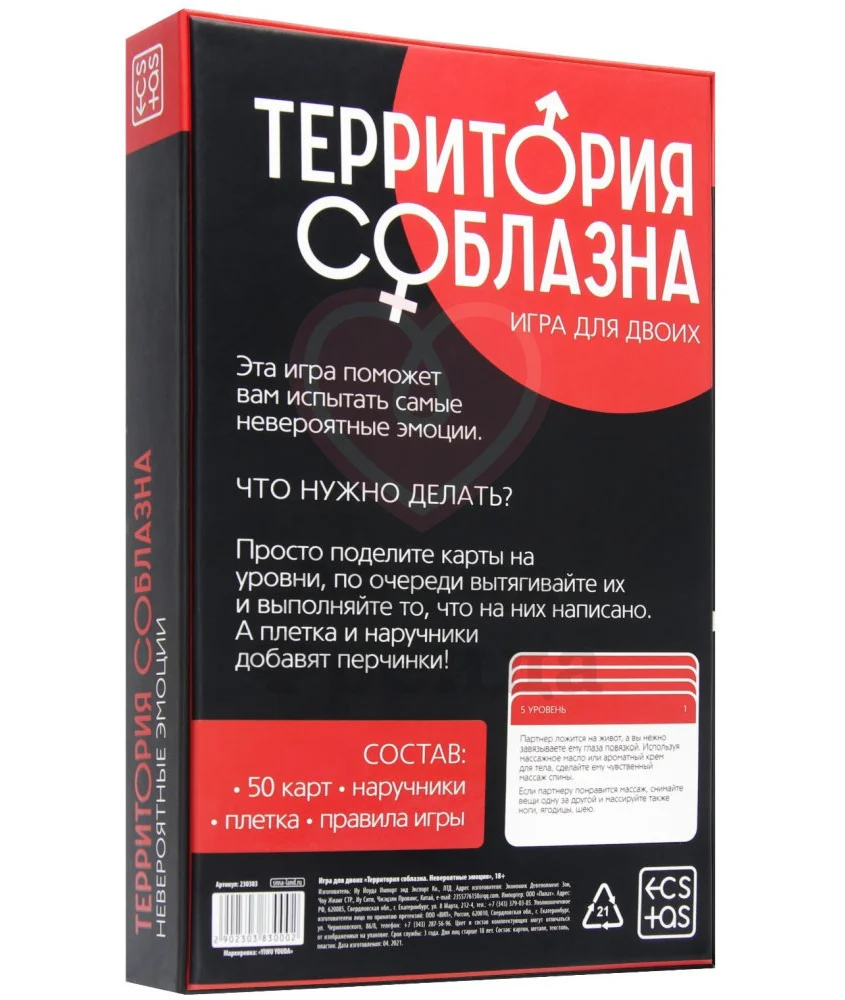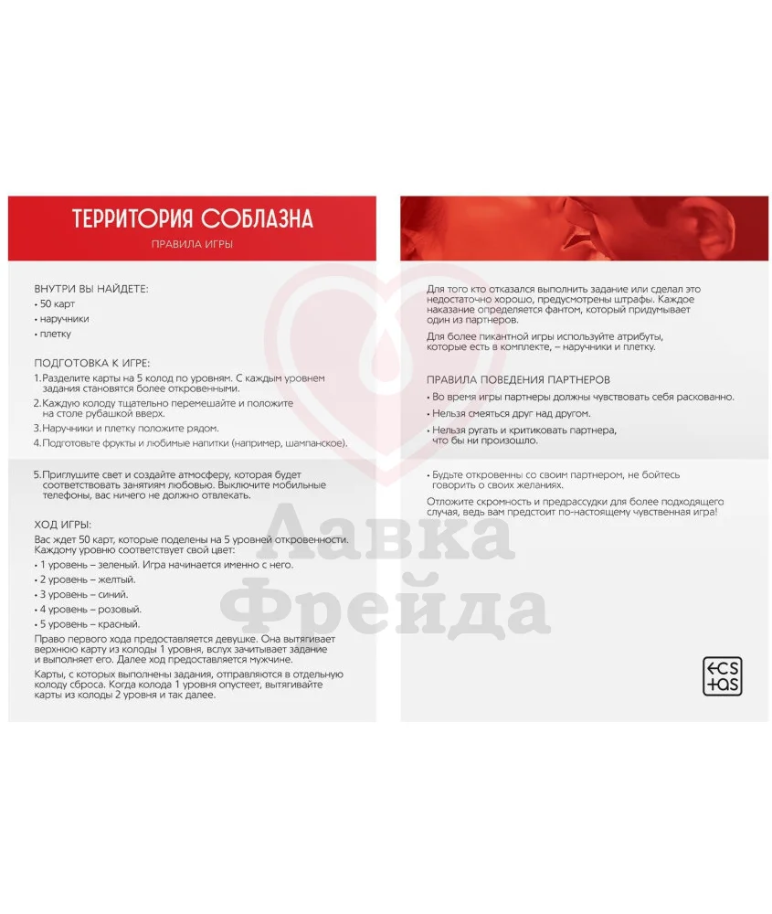 В этой игре вашими помощниками по сближению с партнёром будут 50 карточек, разделённые на пять уровней взаимодействия. Первый уровень познакомит вас ближе, второй разовьёт фантазию, третий подойдёт для флирта, четвёртый идеален для прелюдии, а пятый позволит поэкспериментировать в процессе секса. Компанию карточкам составят наручники, плётка, которые заботливо лежат в комплекте и, конечно же, ваш партнёр.
