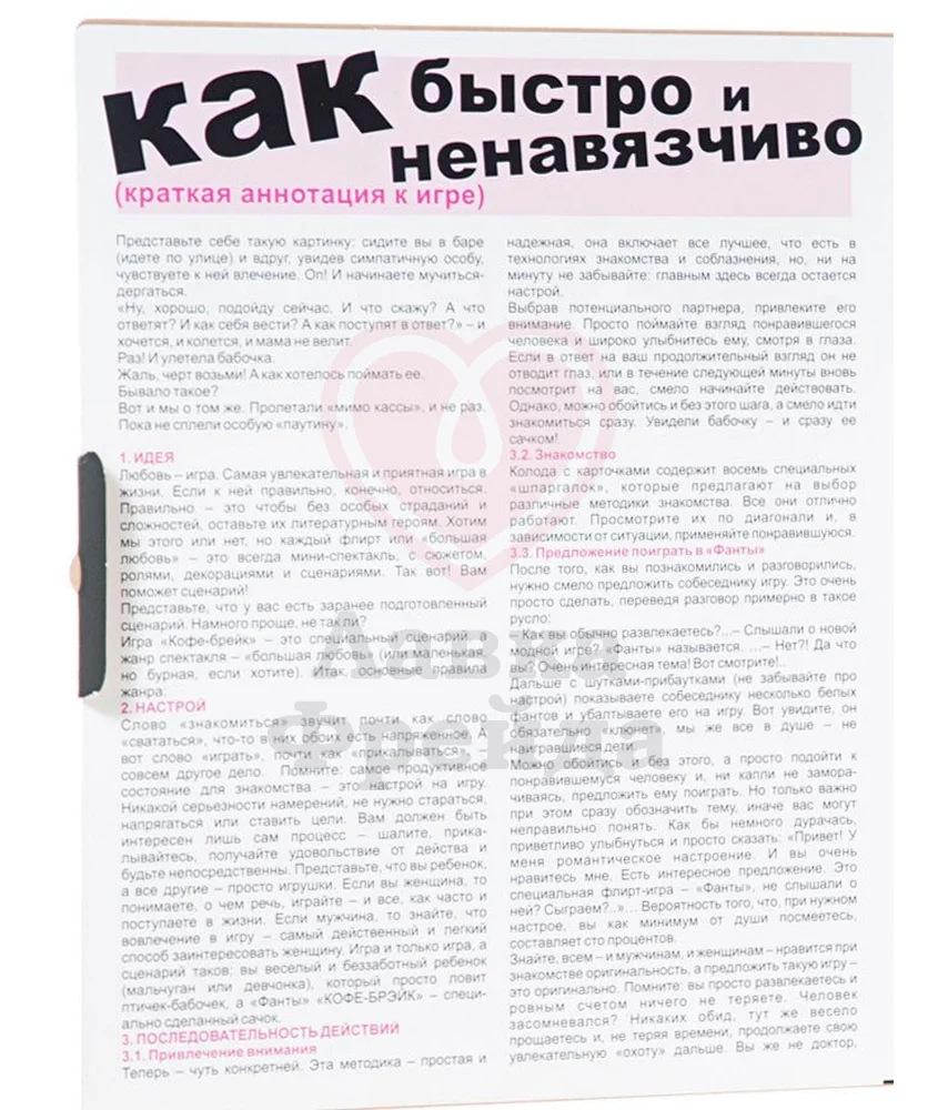 Настольная игра «Фанты Флирт №1 Кофе-брэйк» - это пикантное развлечение с загадками, ведь играть можно в любом общественном месте так, что никто и не поймет, что перед вами – интимный способ поразвлечься. Игра создана специально для первого свидания и содержит 40 карт с заданиями и 8 с инструкцией.