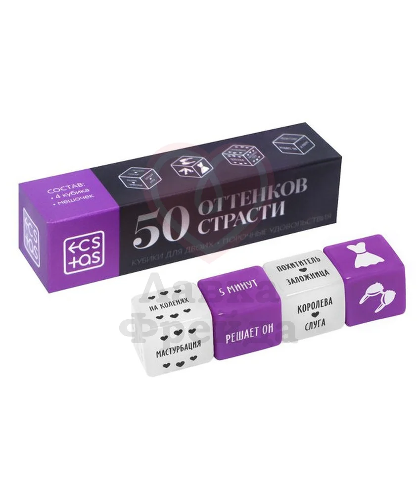 В наборе для двоих «50 оттенков страсти. Порочные удовольствия»: 4 кубика для определения ролей в соблазнительной игре, предмета одежды на девушке, практики и времени её исполнения. А также небольшой мешочек для хранения.