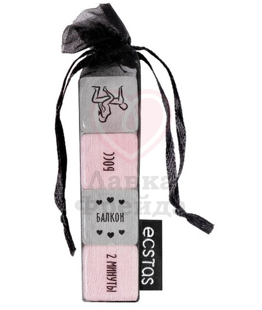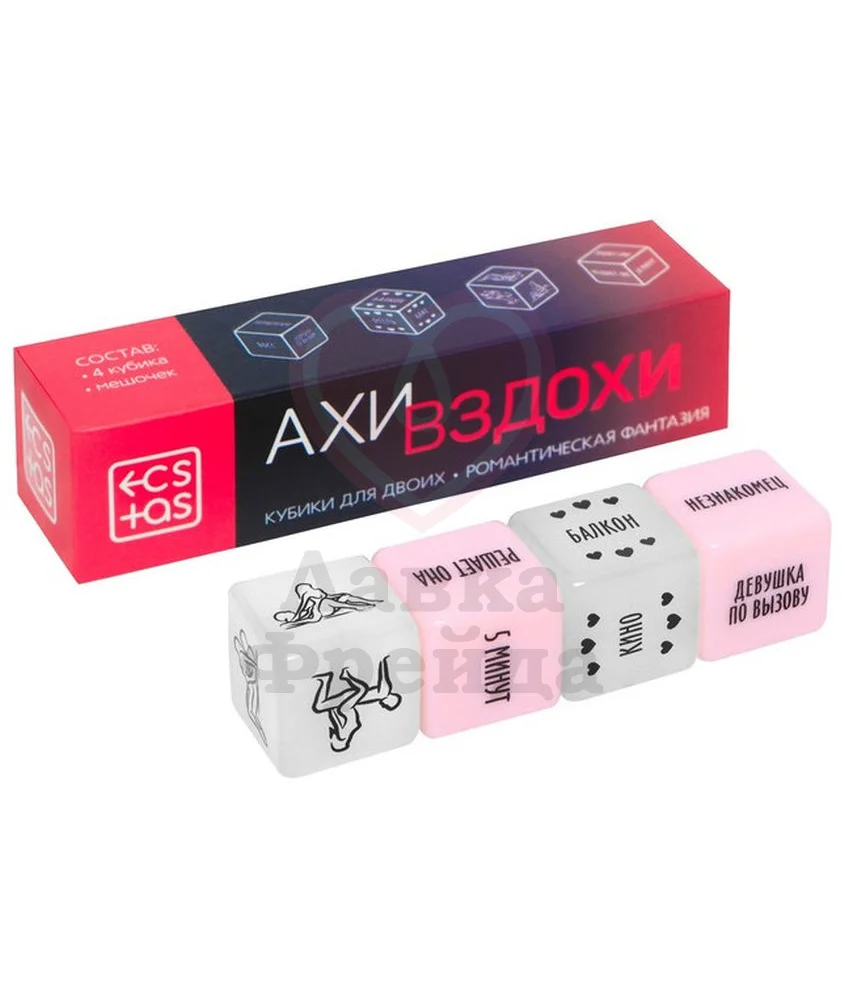 В наборе для двоих «Ахи вздохи. Романтическая фантазия»: 4 кубика для определения ролей в соблазнительной игре, место и позу, использующую в сексе, и время взаимодействия. В комплекте также есть небольшой мешочек для хранения.