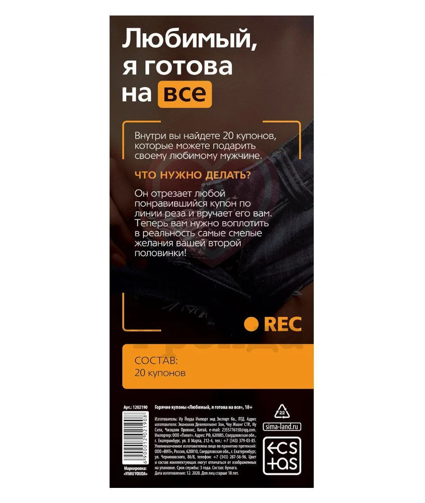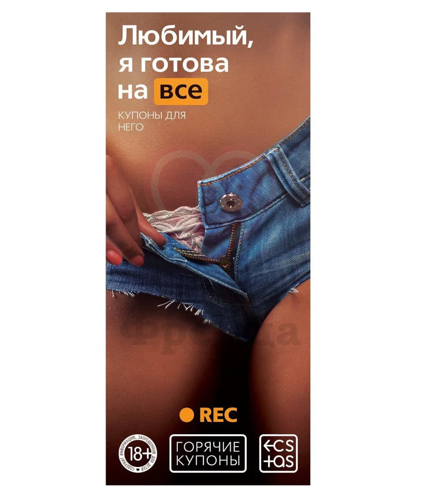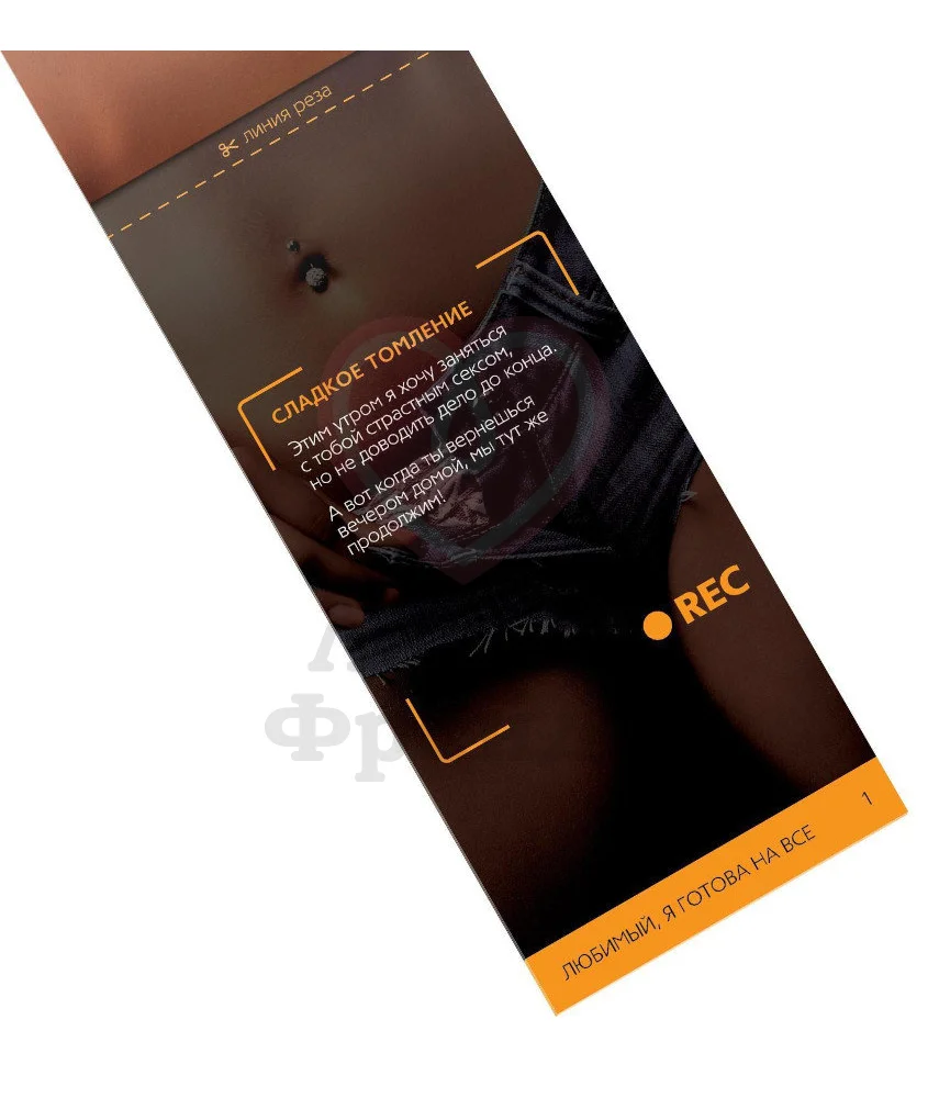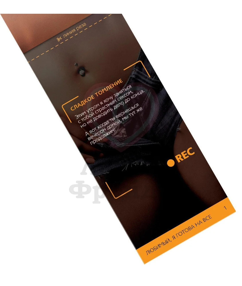 Купоны «Любимый, я готова на всё» приглашают не только вашего партнера, но и вас в головокружительное путешествие по сексуальным фантазиям. В набор входит 20 купонов с разными желаниями интимного характера, которые вы вручаете любимому. А он может воспользоваться ими в любой момент, что только подогревает страсть.