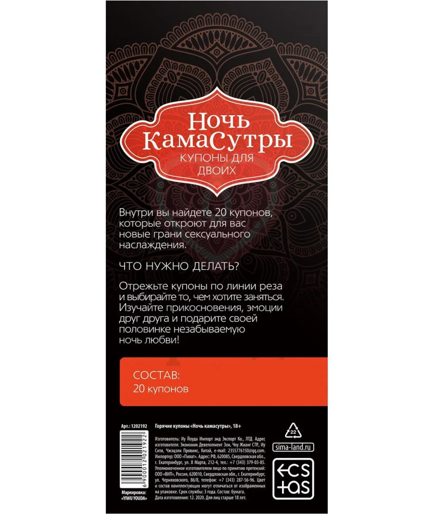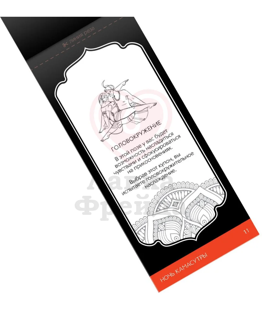 Купоны «Ночь Камасутры» - удивительный набор для пар, который дополнит и приукрасит интимную жизнь. В каждой карточке вы найдете самую откровенную и приятную позу, подобранную авторами, из сборника индийских учений. Но следует учесть, что отказаться от ее исполнения при получении купонов вы не сможете.
