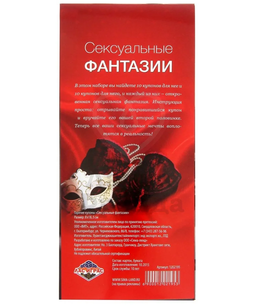 Купоны для эротических игр «Сексуальные фантазии» - то, что позволит раскрепоститься партнерам и сделает отношения максимально страстными. То, о чем ваша половинка молчит, теперь станет не просто фантазией, а реализованной мечтой.