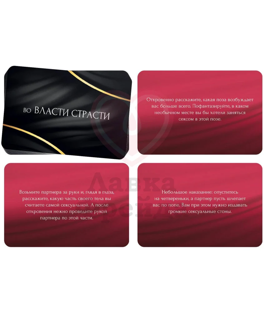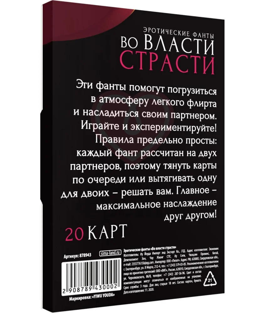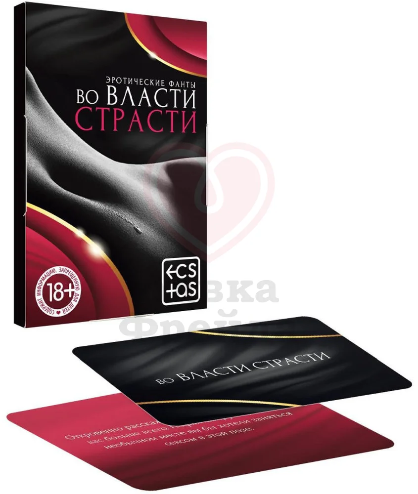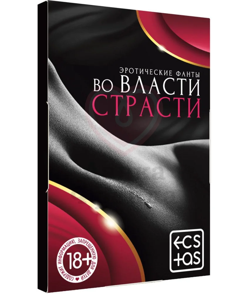 Настольная игра «Во власти страсти» состоит из 20 фантов - 20 карт, на каждой из которой написано одно уникальное задание, погружающее в атмосферу лёгкого флирта и позволяющее еще ярче наслаждаться своим партнёром. Игра предназначена для двух взрослых игроков, поэтому карты можно тянуть либо по очереди, либо использовать одно задание на двоих, обмениваясь эротическими фантазиями и на практике пробуя новое, расширяя границы сексуального опыта. Рассказывайте о своих сокровенных фантазиях в игровой форме и открывайте прежде скрытые грани вашей любви, а вот куда вас приведёт игра - решать только вам!