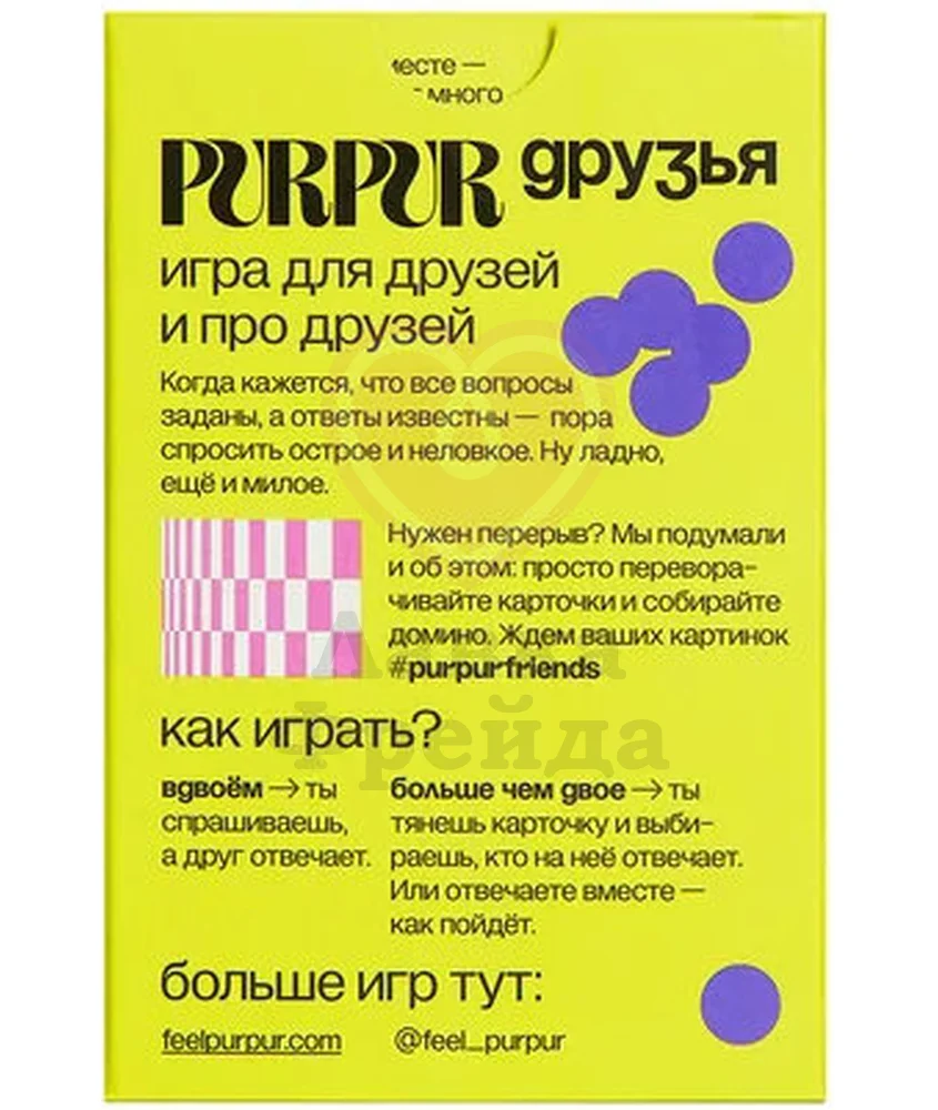Настольная игра Пурпур.Друзья идеально подходит для проведения досуга как вдвоем, так и небольшой компанией. В наборе 55 карточек с вопросами из 10 категорий - о взглядах на жизнь, воспоминания, неловкие вопросы, которые всегда интересовали, но было неловко задать и многое другое.