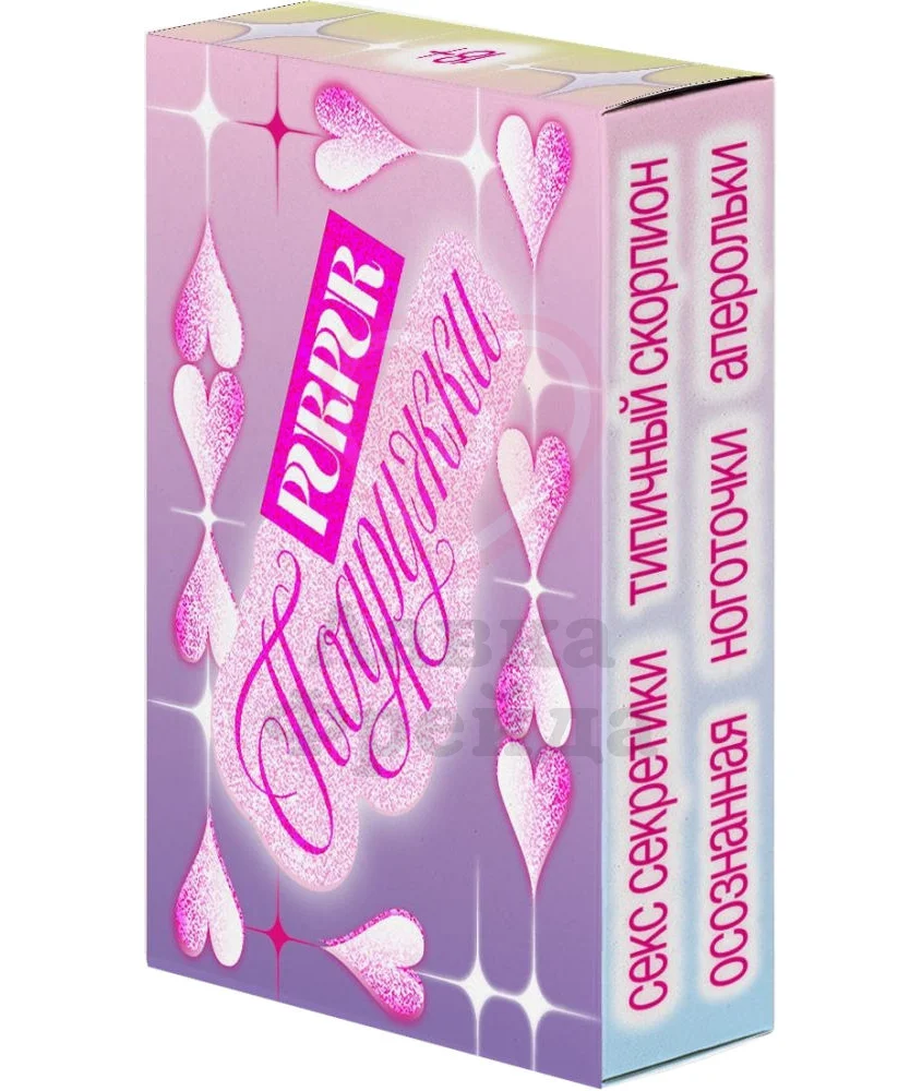 Purpur Подружки ― настольная игра, которая идеально подходит для того, чтобы еще лучше узнать своих подруг, либо навести мосты в общении с новыми приятельницами. Игра состоит из 57 карт, на каждой из которой написаны вопросы: