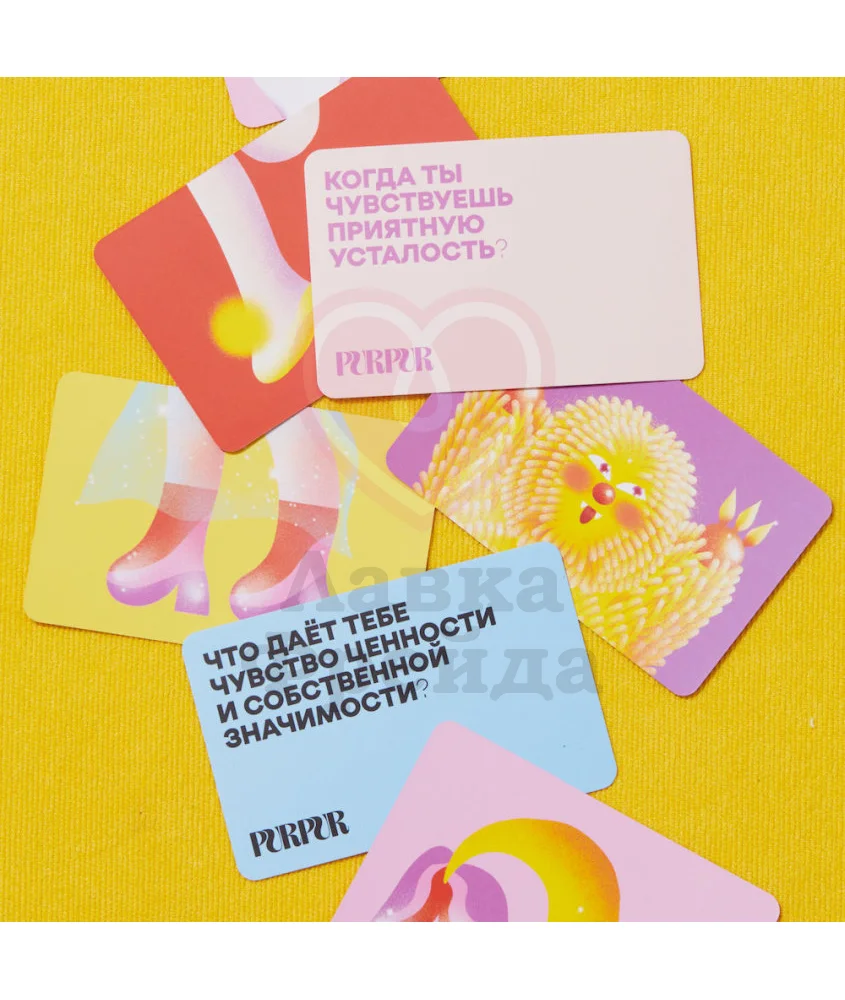 Настольная игра Пурпур.Знакомства подходит для уютного вечера в компании друзей, свидания или для интересного начала любого знакомства. В наборе 47 карточек с вопросами различной тематики - от вопроса "Как выглядит твоя спальня?" до "Что дает тебе чувство ценности и собственной значимости?".