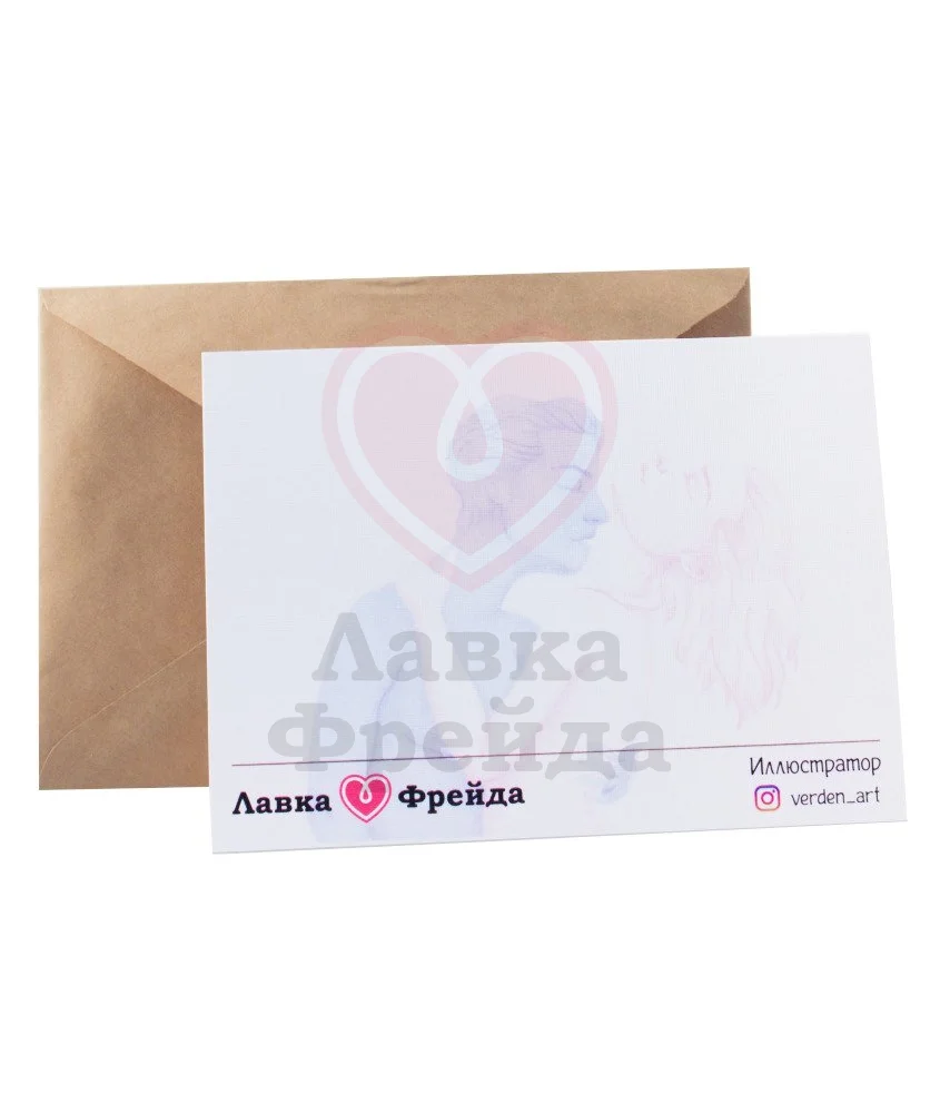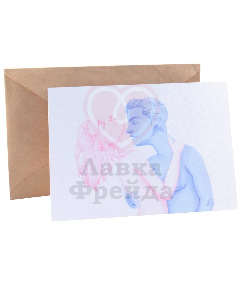 Открытка с изображением целующейся влюблённой пары сможет стать ещё одним способом выразить ваши самые искренние чувства: оставьте на обороте своё признание, комплимент или просто пару приятных слов — главное ведь внимание! Открытки были созданы художницей @verden_art специально для Лавки Фрейда.