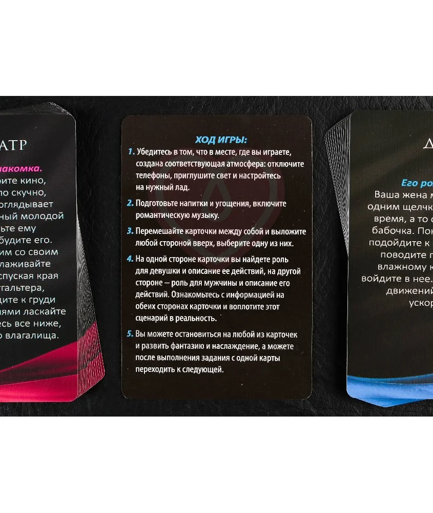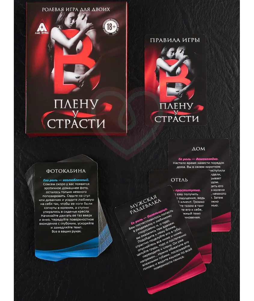 Игра «В плену страсти» предоставляет 30 карт с ролевыми сценариями для пары: каждая карта двусторонняя — на одной из сторон указания для мужчины, а на второй — для женщины. Каждый из вас сможет побывать в необычайных ролях и воплотить в жизнь свои давние эротические фантазии. При желании вы можете использовать игровые костюмы или разные девайсы, главное, чтобы всем нравилось происходящее.