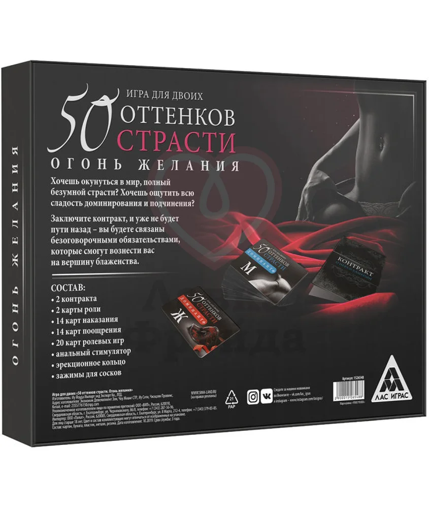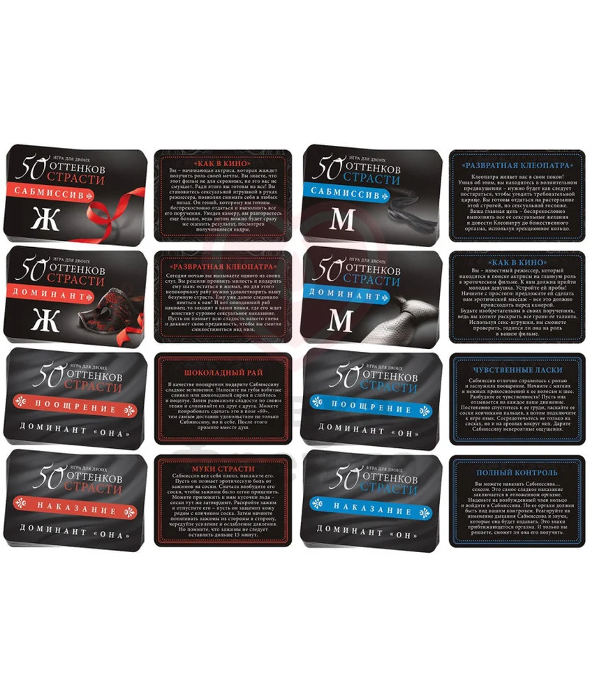 20 карт с ролевыми сценариями позволят сделать игру ещё насыщеннее. Примерьте на себя образы сексуальной секретарши и нового босса, беззащитной пациентки и похотливого врача, властной Клеопатры и покорного раба. И это лишь малая часть сценариев, которые предлагает игра «На 50 оттенков откровеннее».