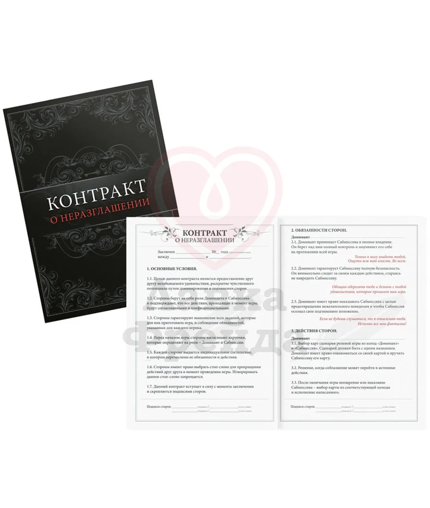 Если вы уже давно хотите попробовать БДСМ, но не знаете с чего начать, то эта возбуждающая игра станет прекрасным стартом для вас обоих. Воплотите в жизнь свои желания о доминировании и подчинении. В наборе вы найдёте 2 контракта о неразглашении вашей маленькой тайны.