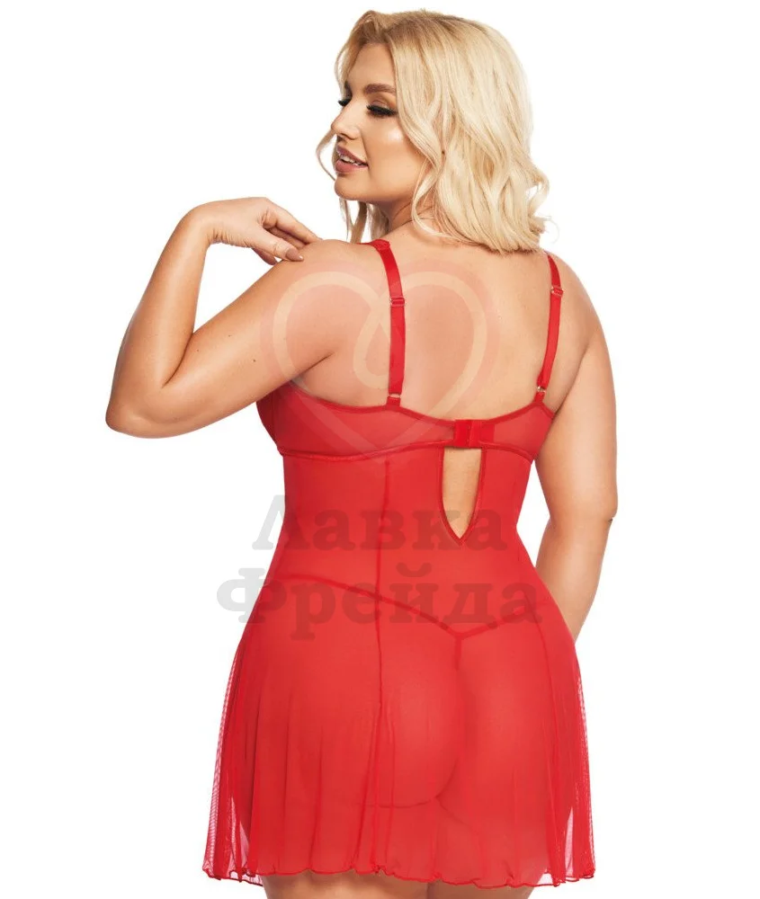 Комбинация создана в простом, но в то же время сексуальном стиле. Сетчатая полупрозрачная ткань открывает вид на живот и бёдра, а плотные чашечки скрывают грудь, заставляя работать фантазию партнёра на полную. Косточки создают крепкую поддержку для груди, приподнимая её и создавая глубокое декольте. Застёжка и бретели позволяют регулировать посадку под собственные предпочтения. Стринги входят в комплект.