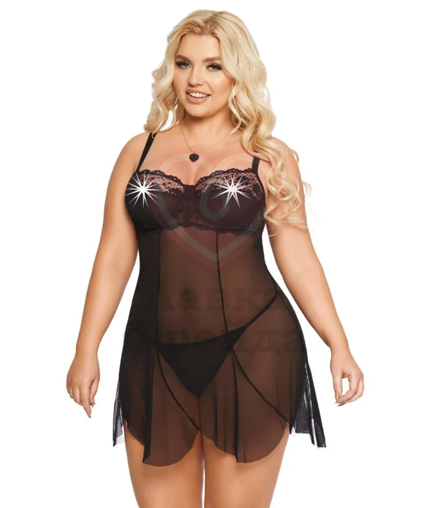 Летящая полупрозрачная ткань подола будет дразнить вашего партнера игривым видом, а аккуратный облегающий лиф сорочки — подчеркнет грудь изящным кружевом и глубоким декольте. В комплект SoftLine Collection Carla входят воздушное платье, дополненное трусиками-стрингами. Получается изящный и соблазнительный образ для романтичной ночи.