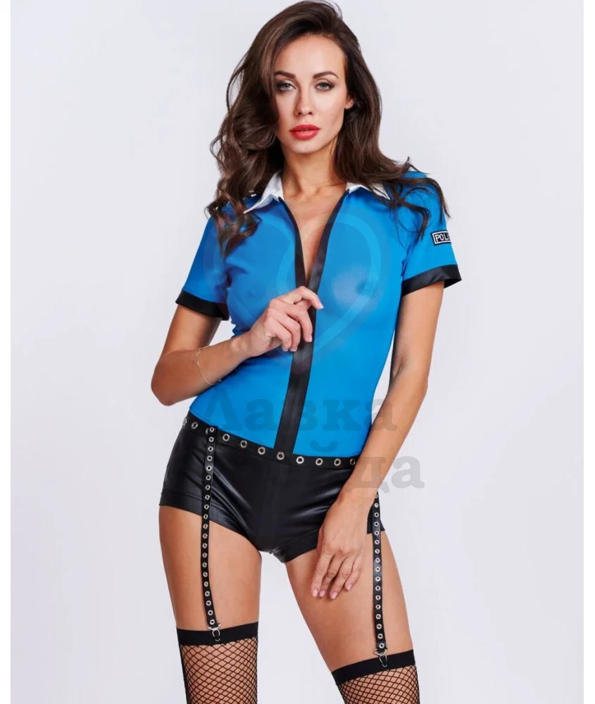 Арестуйте правонарушителя и накажите его по всей строгости закона в костюме полицейского. Боди-комбинезон, стилизованный под классическую рубашку полицейского, сшит из полупрозрачной синей ткани, через которую будет красиво просвечиваться ваше тело. Рубашка дополнена короткими рукавами, молнией по всей длине и нашивкой с надписью Police. Нижняя часть, выполненная в виде кожаных мини-шортиков, украшена серебристыми люверсами. Образ дополняют высокие чулки в сетку и пояс для чулок, также украшенный люверсами.