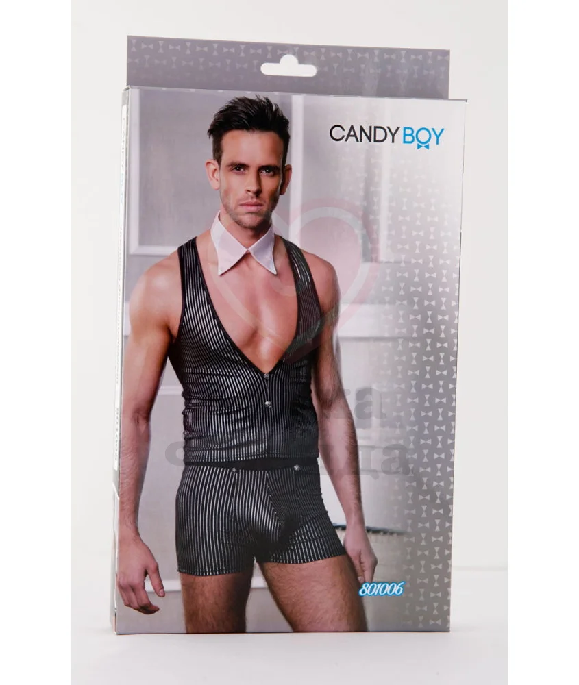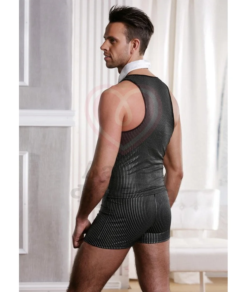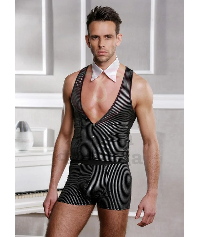 Костюм джентльмена-соблазнителя состоит из жилетки и трусов-шортов с узором из вертикальных полос. Наряд украшен металлическими пуговицами, а также дополнительным аксессуаром в виде воротничка на липучке. Идеальный образ как для классической ролевой игры, так и для возбуждающего танца.