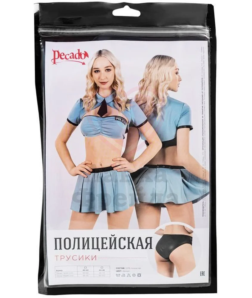 Трусики Pecado BDSM - это нижняя часть сексуального женского комплекта в виде полицейской униформы, сшитая из приятного телу, высококачественного бифлекса под кожу. Этот материал плотный, но легкий, поэтому он не сковывает движения. Трусики красиво обтягивают тело, подчеркивая красоту бедер и попки. Вы можете отдельно приобрести юбочку полицейского и верхнюю часть комплекта, состоящую из топа, жакета и галстука.