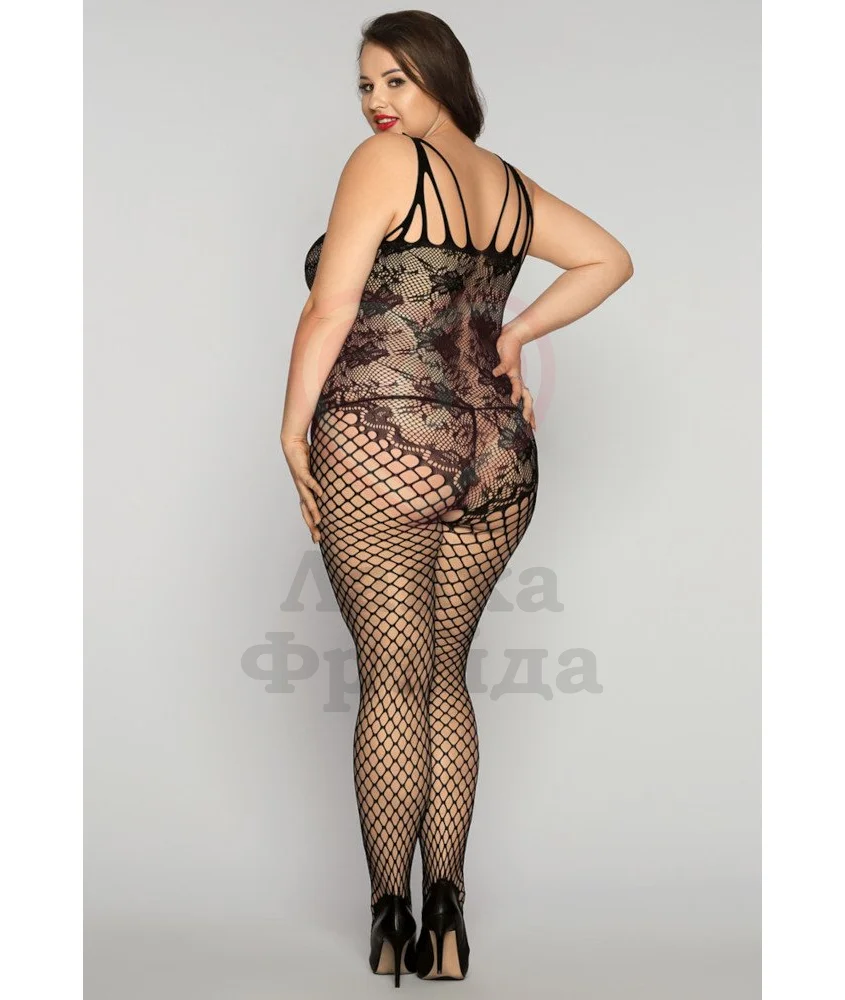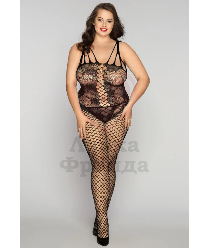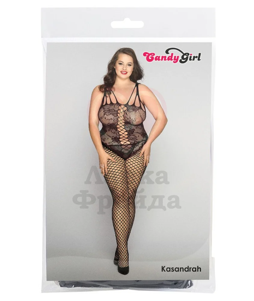Облегающий костюм Candy Girl Kasandrah сочетает в себе ажурный узор и крупную сеточку, которые создают единый соблазнительный силуэт. Костюм имитирует кружевное боди и колготки, при этом являясь одним полноценным предметом гардероба. Внизу в интимной зоне есть специальный вырез, чтобы использовать кэтсьют в постели было максимально удобно. В комплект также включены трусики-стринги.