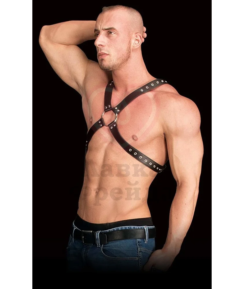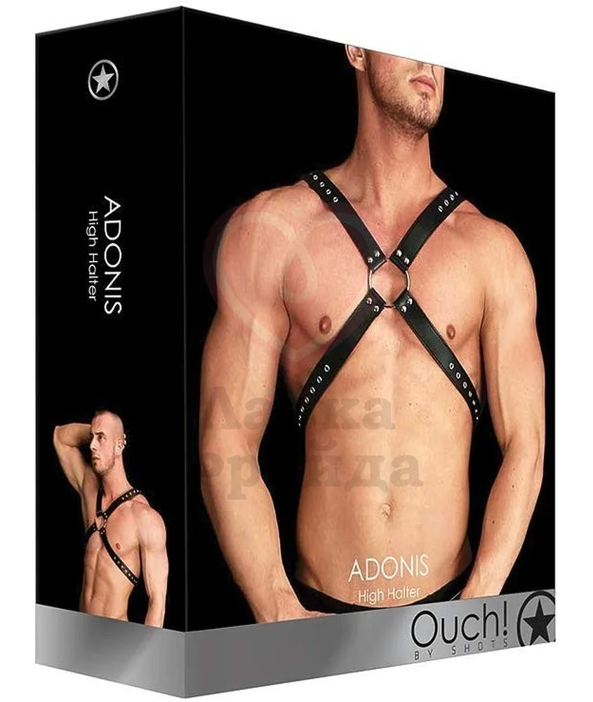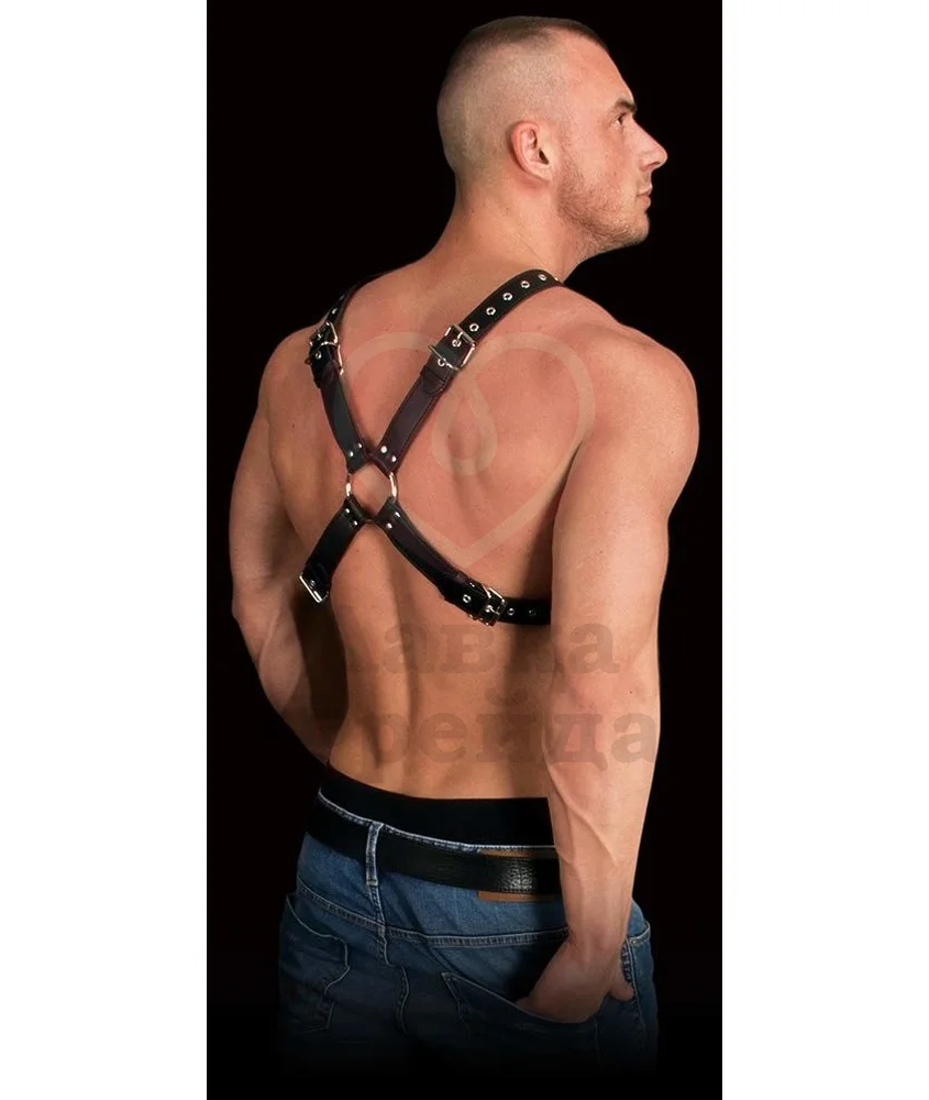 Мужская портупея Адонис от бренда Ouch! состоит из четырех регулируемых ремешков, соединённых металлическими кольцами спереди и сзади, создавая крестообразный узор. Выгодно подчеркнёт фигуру и мышцы груди. Подойдёт для тематических вечеринок или эротических игр.