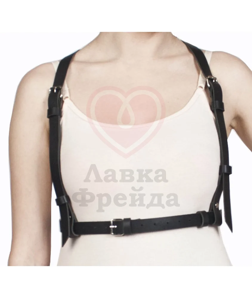 Классическая портупея с ремешком под грудью и на плечах, выполнена из натуральной кожи с металлической фурнитурой. Обхват регулируются при помощи пряжек, подходит для размеров 42-48. Такой стильный аксессуар можно носить в качестве запоминающейся детали — поверх повседневной одежды, а также как часть особенного образа для специальной вечеринки или романтического вечера.