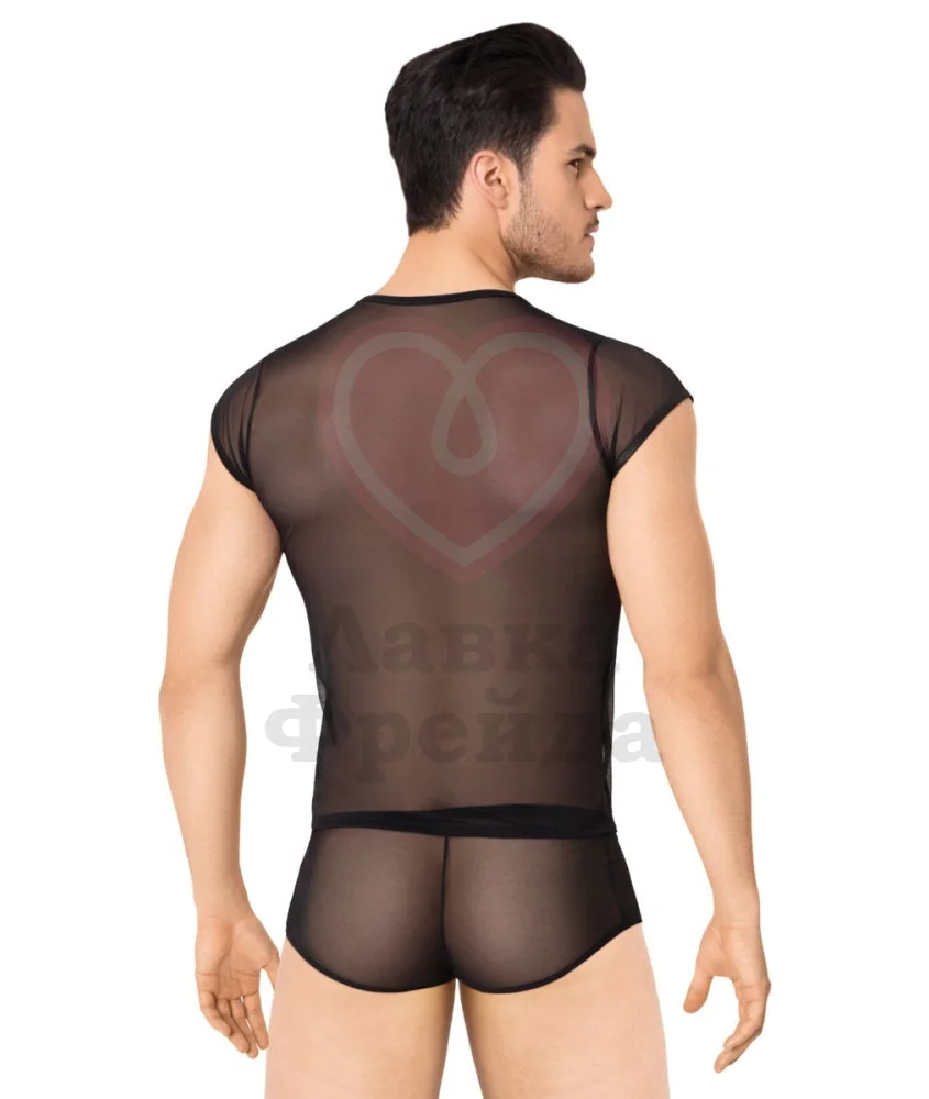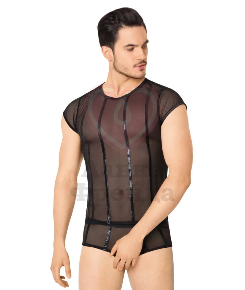 Мужской комплект из полупрозрачной ткани, состоящий из футболки и трусов-шорт. Одежда выполнена из мягкого текстиля, спереди украшена вставками из более плотного материала с эффектом мокрой ткани. Выпускается в нескольких размерах. Такое бельё сможет стать неожиданным дополнением для страстного вечера.