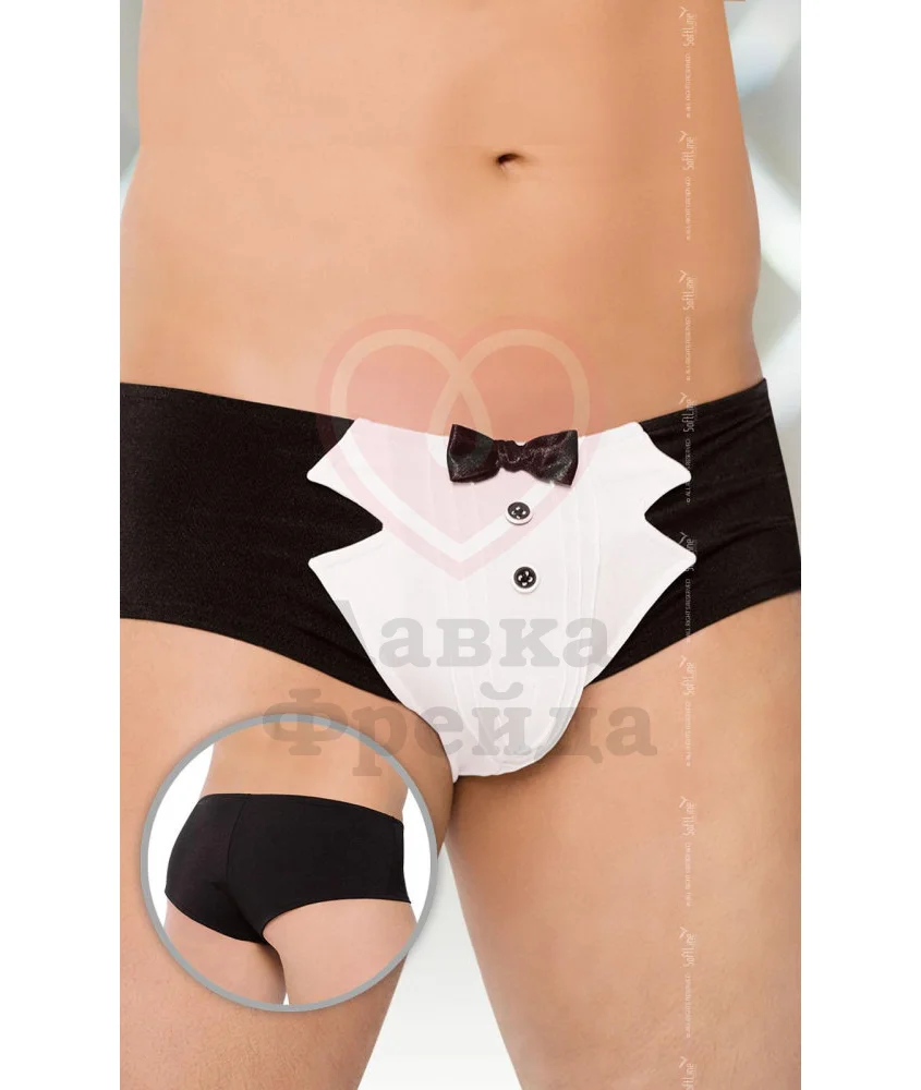 Трусы-шорты с имитацией костюма официанта позволят вам сыграть в маленькую ролевую игру со своей половинкой. Бельё украшено пуговицами и чёрным галстуком-бабочкой.