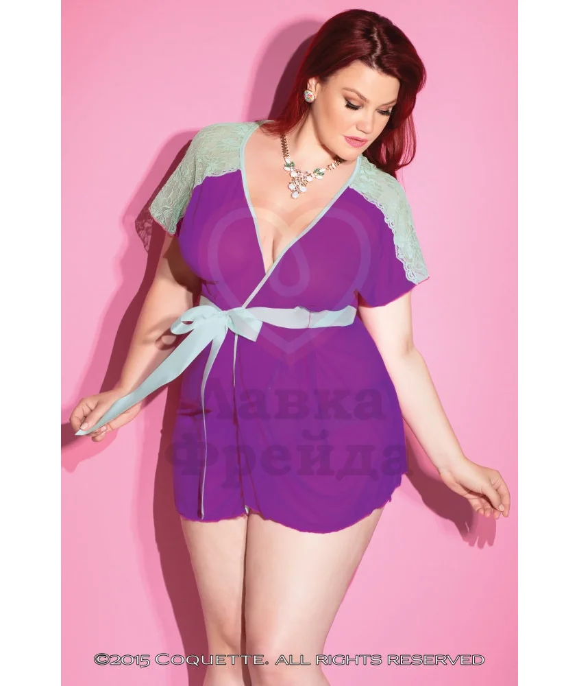 Роскошный мягкий халатик с украшением из кружев на плечах. Необычное яркое сочетание цветов - маджентовой лилии мягкой ткани и мятных кружев на плечах. В комплекте атласный поясок.