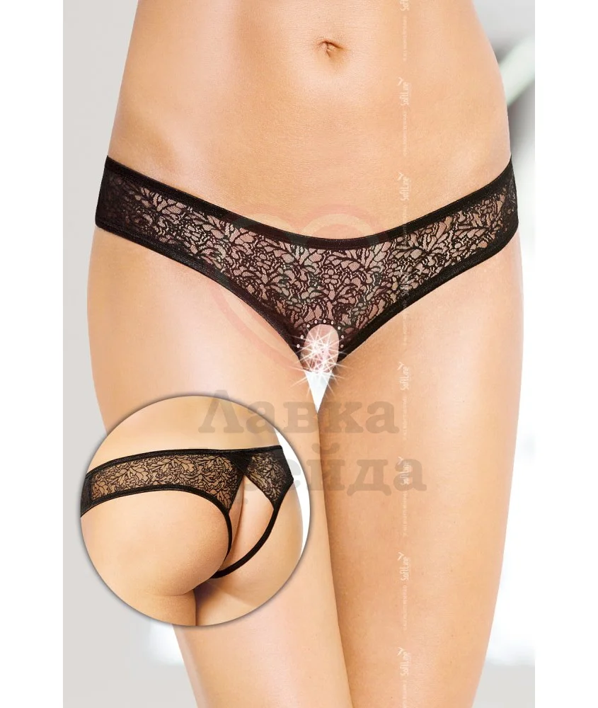 Чёрные трусики с открытым доступом изготовлены из нежного кружева. Бельё украшено стразами и вырезом на попке.