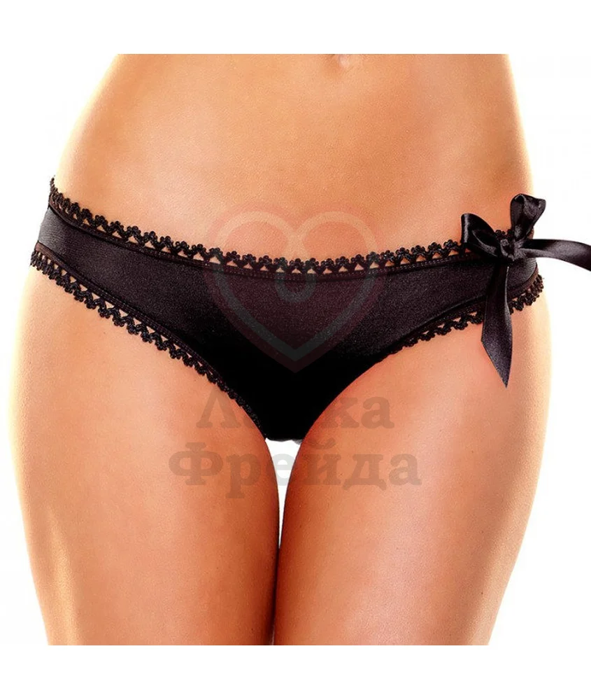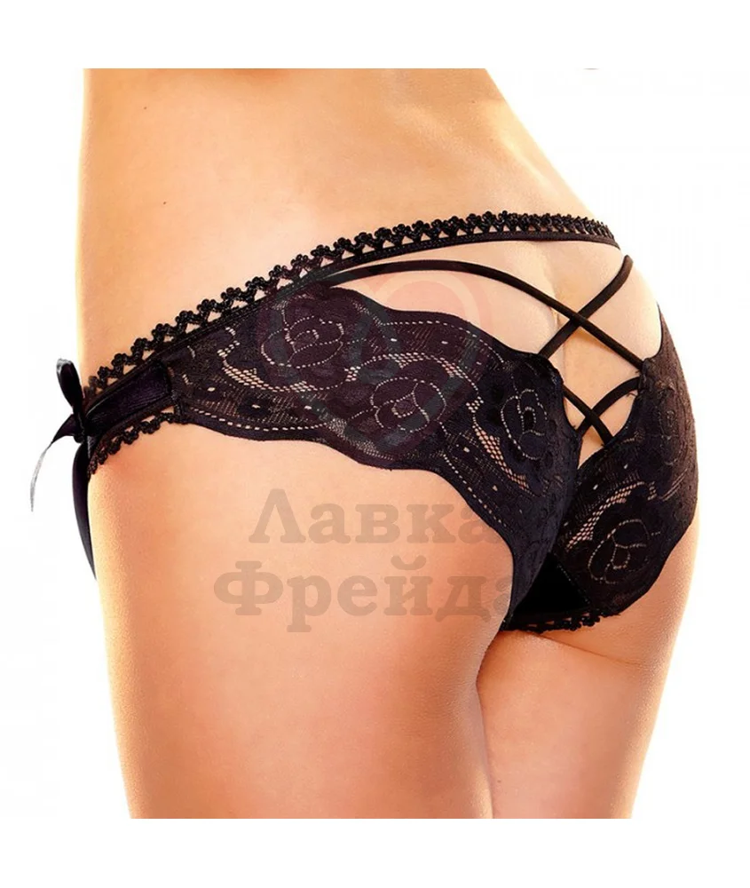 Оригинальные трусики с бантом приятно прилегают к телу. Легкий атлас в черном цвете спереди, сзади трусики выполнены из кружев с необычным плетением тонких резиночек крест на крест.