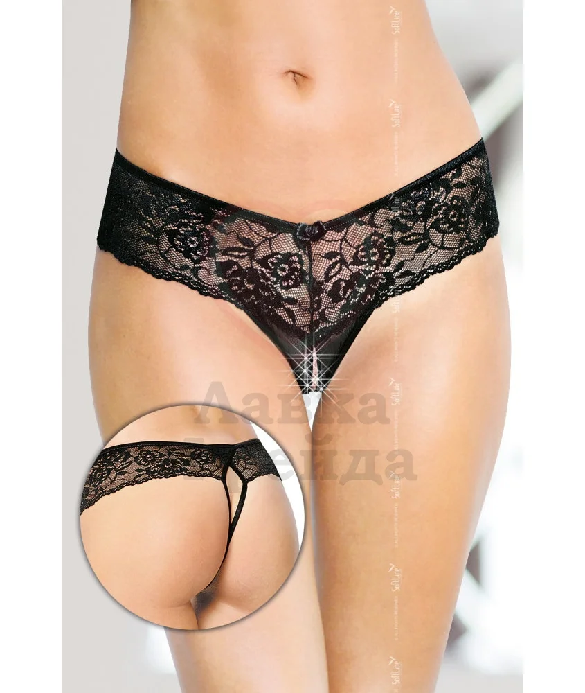 Широкие кружевные трусики выполнены из тянущейся ткани, плотно прилегающей к телу и делающей акцент на изгибах бёдер. Декоративный бантик добавляет образу невинности. Доступ снизу позволяет предаваться любви не снимая бельё.