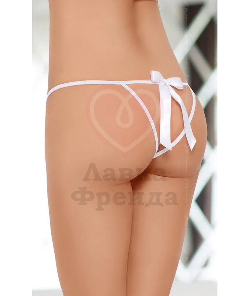 Трусики выполнены из белого цветочного кружева и украшены маленьким бантиком спереди. Тонкая резинка комфортно сидит на бёдрах благодаря спандексу в составе. Открытый вырез на попке украшает пышный атласный бант. Интимный доступ позволяет не раздеваться во время занятий любовью.