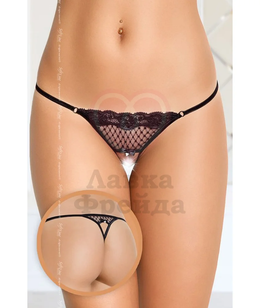 Трусики-стринги с открытым доступом выполнены из сочетания кружева и сетчатого материала. Дополнительно украшены двумя бантиками и бусинками.