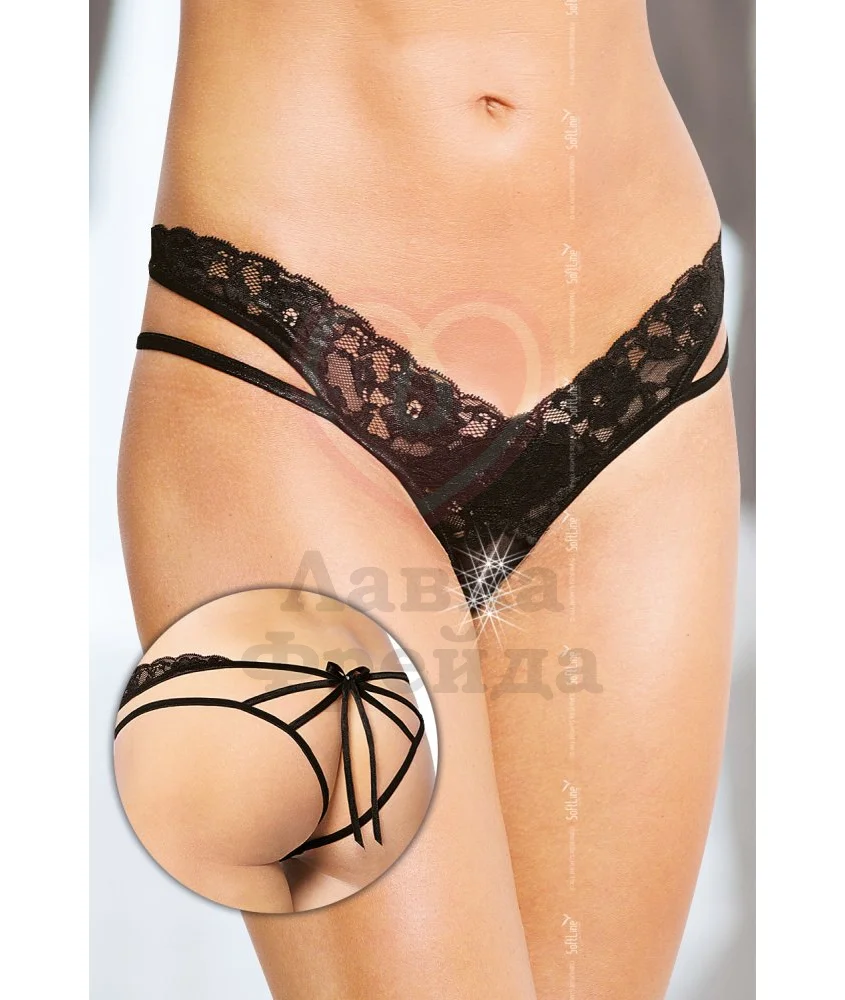 Чёрные кружевные трусики на высокой талии украшены переплетением тесьмы на попке и маленьким бантиком. Пикантный доступ позволяет не раздеваться перед занятиями любовью.