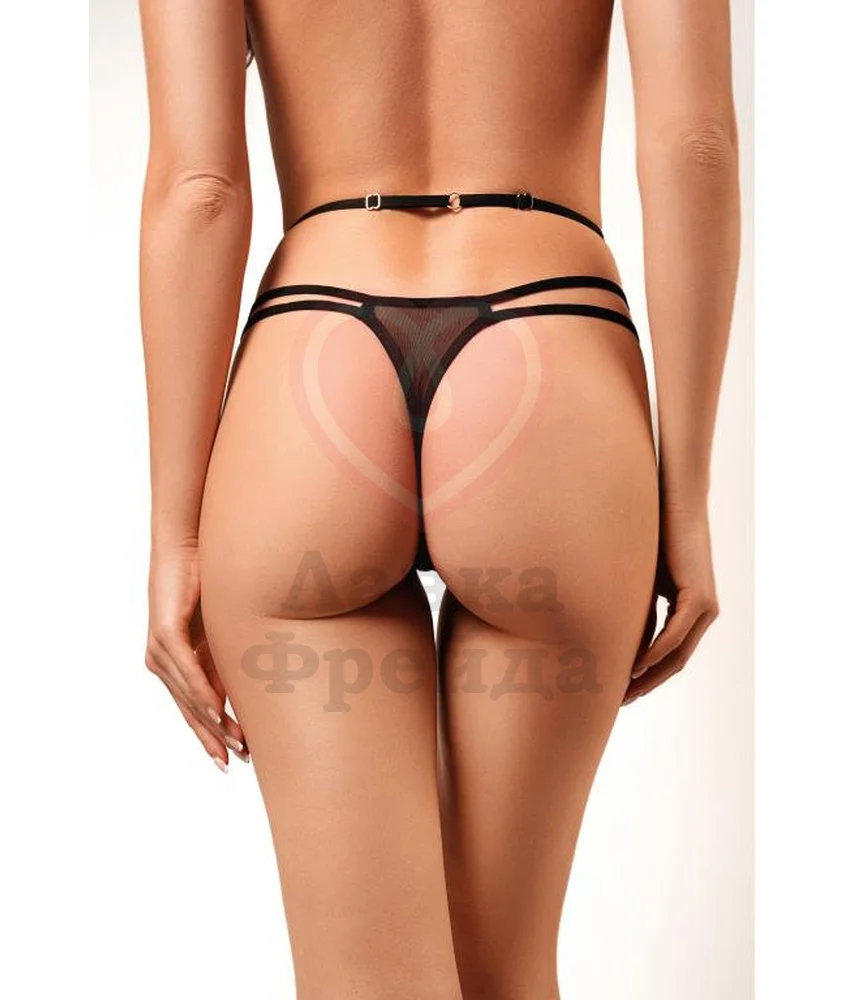 Трусики-стринги Amor El выполнены из ажурного кружева и дополнены эластичной лентой, которая, как тонкий пояс, подчеркивает талию. Трусики украшает дополнительная полоска из кристаллов — блестящая деталь для привлечения чужого взгляда.