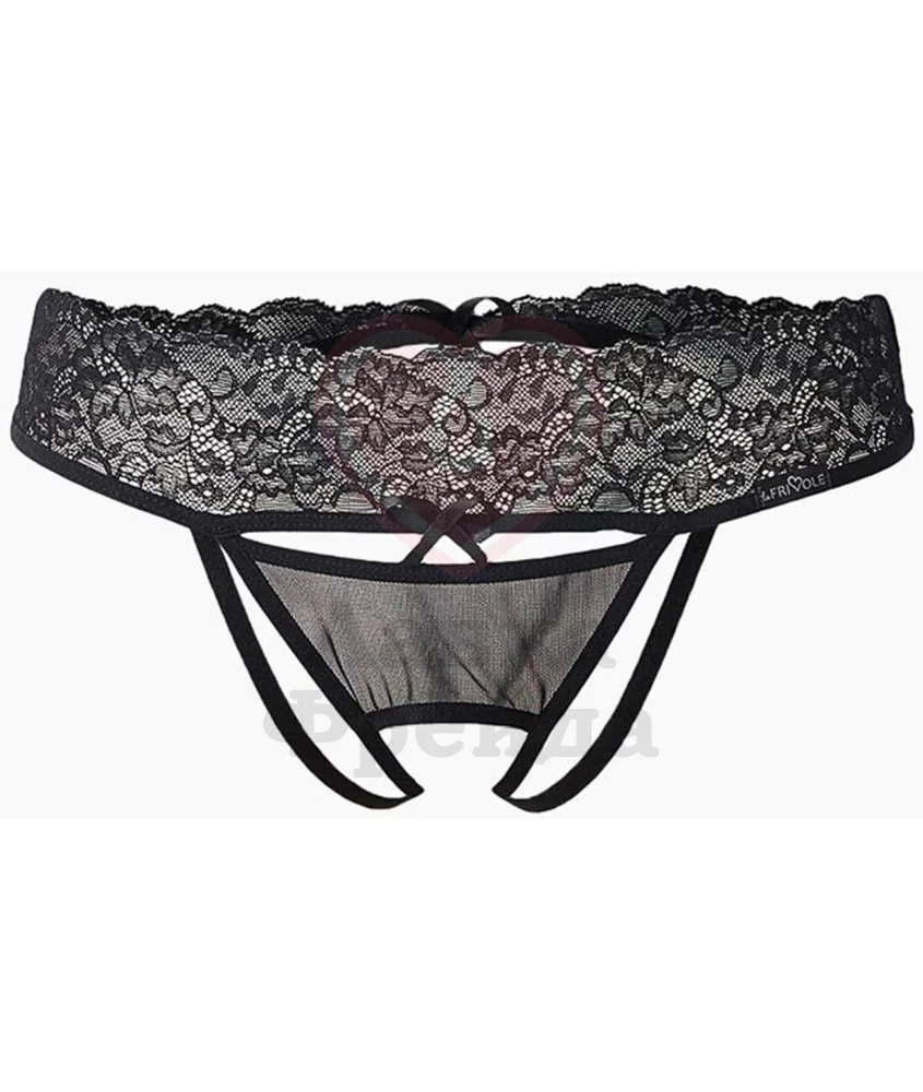 Невесомые женские трусики Easy To Love сшиты из нежного мягкого кружева чёрного цвета, через которое красиво будет просвечиваться ваше тело. Передняя часть модели закрыта, зато задняя часть полностью оголяет попку - её прикрывают две узкие ленточки и кружевная строчка, украшенная миниатюрным бантиком. В этих трусиках вы сможете заниматься сексом, не снимая белья - модель дополнена специальным разрезом в нижней части изделия.