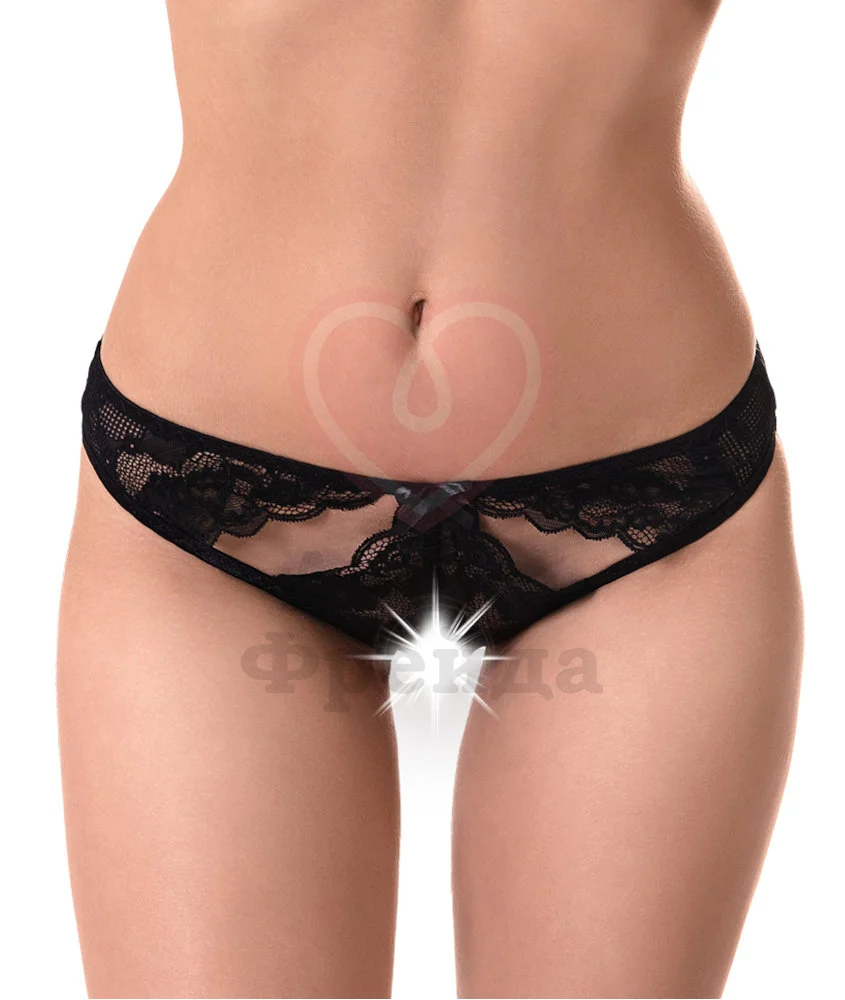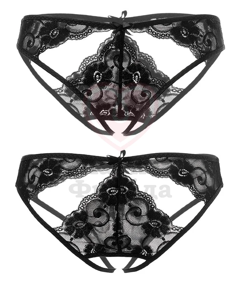 Эротические трусики кружевные, эластичные, с декоративными ажурными вырезами, с атласными бантиками.