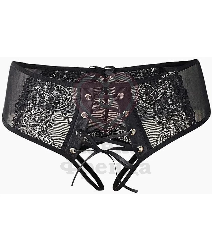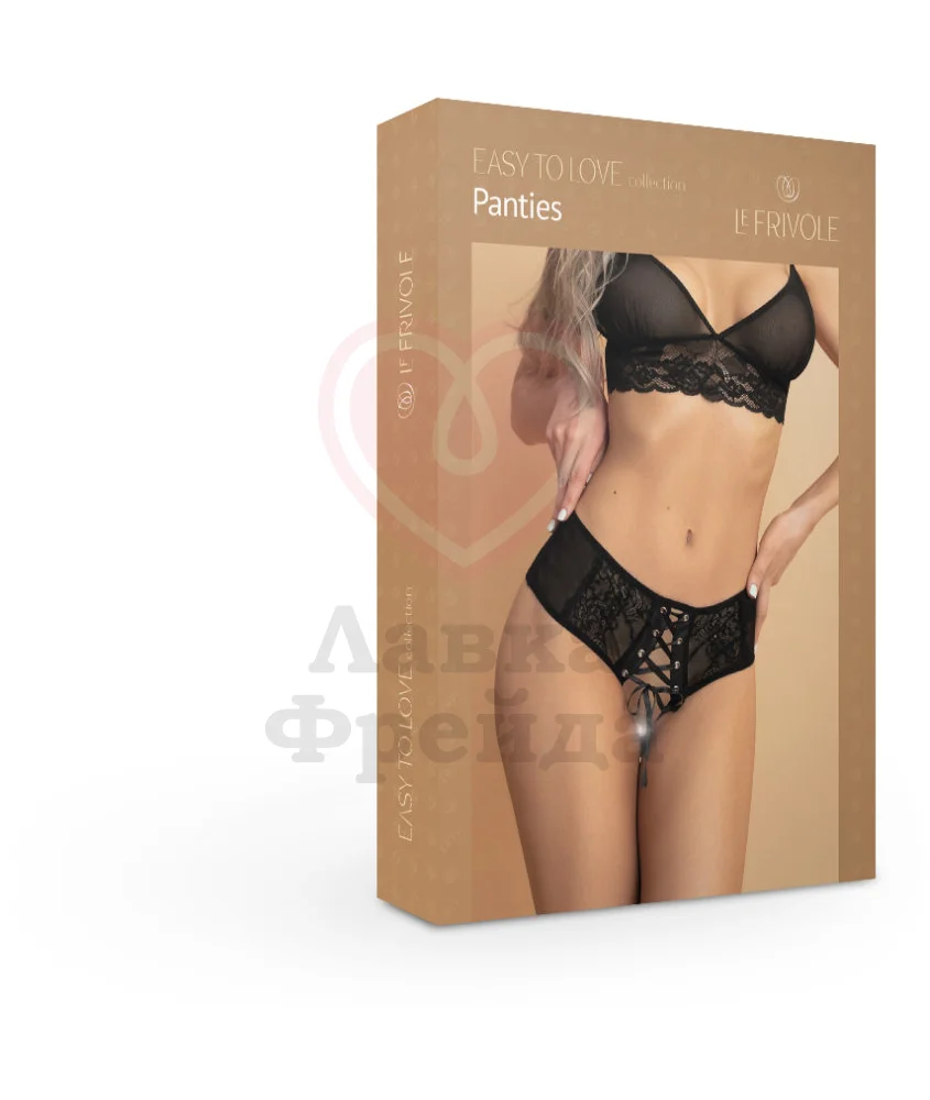 Эффектные женские трусики Easy To Love сшиты в виде шортиков, плотно облегающих бёдра. Модель сшита из полупрозрачной чёрной сетки, через которую будет красиво просвечиваться ваше тело. Сзади трусики открывают ягодицы. Спереди изделие украшено декоративной корсетной шнуровкой, добавляющая образу игривости и кокетства. Модель имеет специальный разрез в нижней части, который открывает доступ к самым интимным частям женского тела и даёт возможность заниматься сексом, не снимая белья.