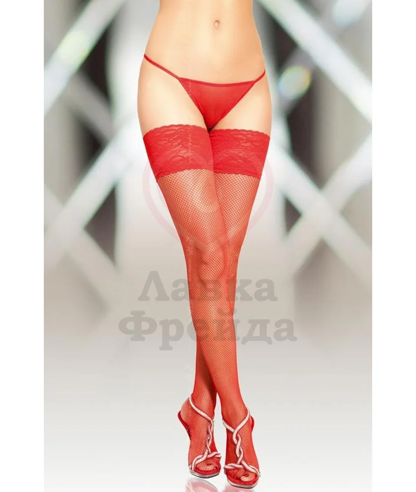 Красные чулочки из мелкой сеточки с декоративным швом сзади и кружевной резинкой. Трусики-стринги и пояс в комплект не входят, но их можно приобрести отдельно.