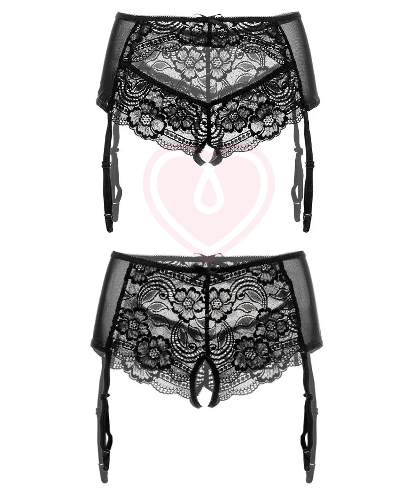 Эротические трусики-пояс из стрейч-сетки, эластичные, со сложными кружевными вставками, с вырезом сзади, без боковых швов, с атласными бантиками. Пажи съемные.