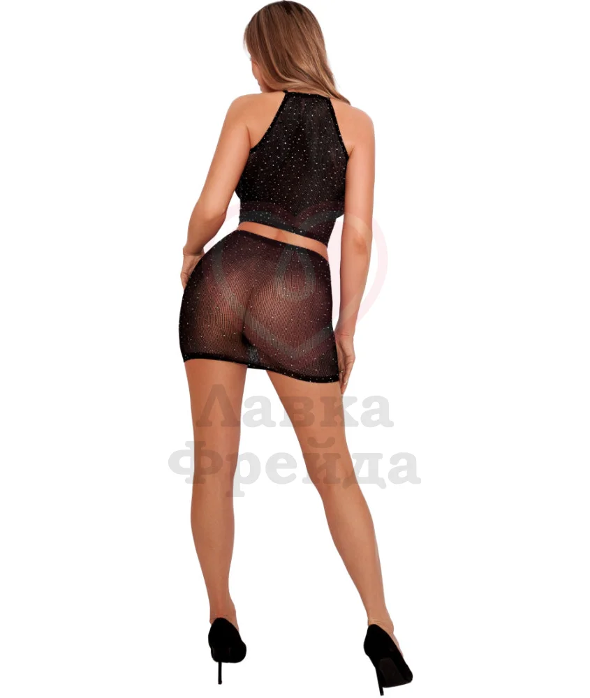 Соблазнительный комплект сшит из эластичной мелкой сетки, через которую будет красиво просвечиваться ваше тело. Состоит из топа, открывающего плечи и животик, и мини-юбки. Топ и мини-юбка окрашены в лаконичный чёрный цвет, а также украшены россыпью сияющих страз, которые будут сверкать при каждом вашем движении. Приятный телу, хорошо тянущийся материал облегает фигуру, подобно второй коже. Сетка сохраняет форму и привлекательный внешний вид даже после сильного растяжения или стирки. На упаковке продукта указаны правила ухода и стирки комплекта, чтобы костюм прослужил вам как можно дольше, рекомендуем придерживаться инструкций.