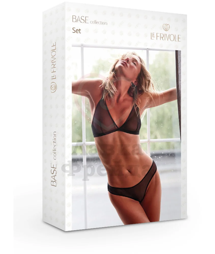Комплект нижнего белья Base сшит из тактильно приятного, эластичного материала, сохраняющего привлекательный внешний вид даже после стирки. Комплект состоит из полупрозрачного мягкого бюстгальтера, подчеркивающего красоту груди, и сексуальных трусиков стрингов. Бюстгальтер идёт без косточек, мягкий материал не сдавливает грудь, а длину лямок можно регулировать, добиваясь идеальной посадки по фигуре.