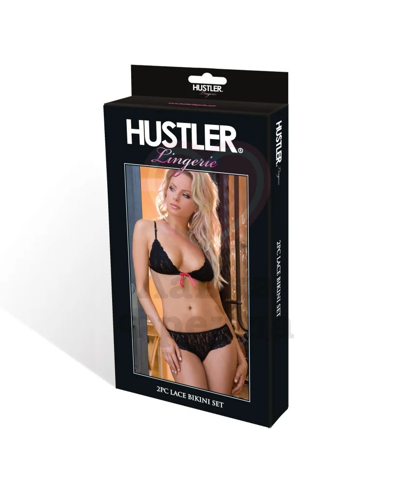 Чёрные гипюровые лиф и трусики. Лиф с тонкими бретелями и тонкой полосочкой на спине, спереди украшен красным бантиком. Трусики-шортики из черных кружев сзади с красной шнуровкой. Размер комплекта универсальный.