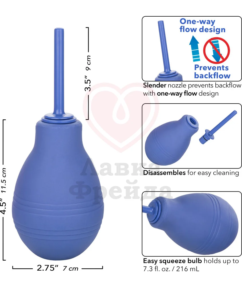 Эластичная груша вмещает в себе до 216 мл жидкости. Чтобы использовать ее необходимо наполнить теплой водой, смазать наконечник лубрикантом на водной основе, ввести носик в анус, а затем медленно сжать колбу, опустошая резервуар. Жидкость нужно удерживать в себе до тех пор, пока вам не захочется от нее избавиться. Для лучшего эффекта, рекомендуется повторить процесс несколько раз. При подготовке перед анальным сексом - очистить прямую кишку лучше минут за 45 до близости. Очищать колбу и наконечник можно как обычной водой с мылом, так и специальным антибактериальным средством для игрушек.