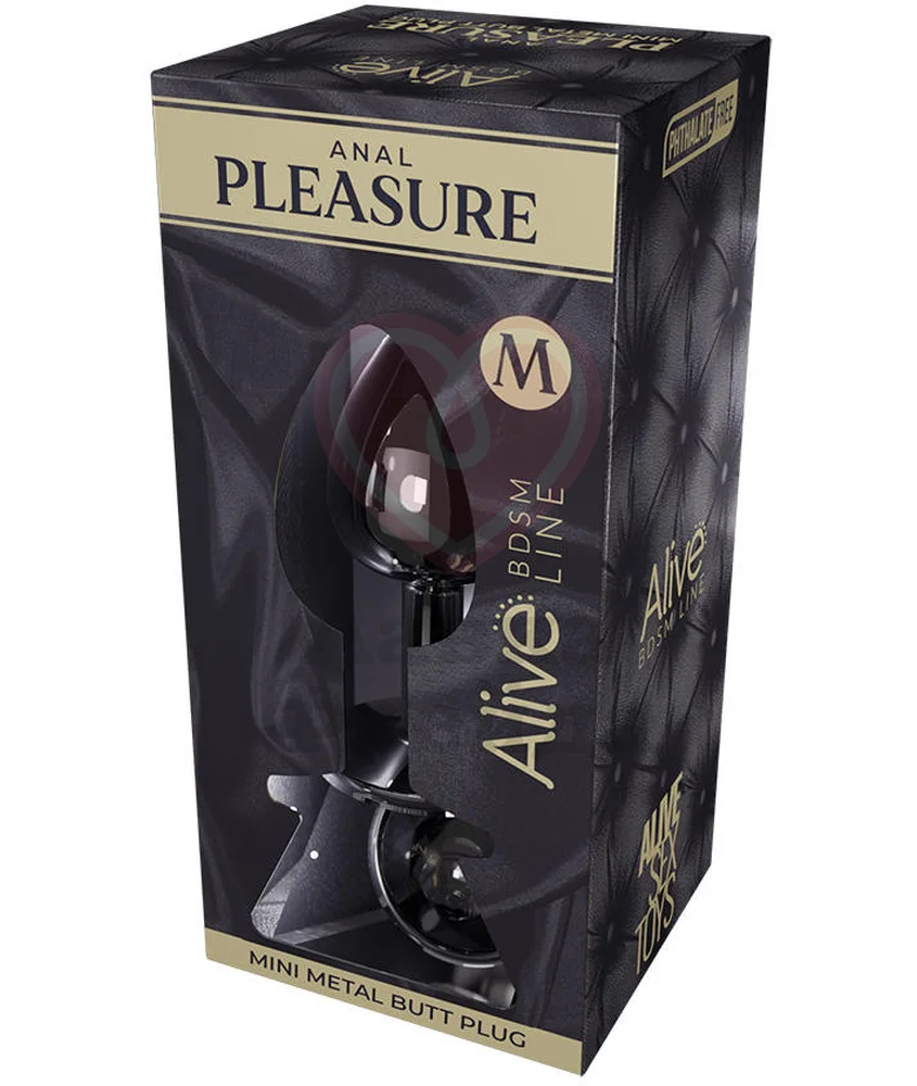 Анальная пробка Alive Mini Metal Butt M имеет широкий ограничитель, не позволяющий втулке проскользнуть внутрь и украшенный круглым стразом чёрного цвета. Кристалл будет красиво сиять в вашей попке при каждом движении. Аксессуар длиной 8 см подходит как новичкам, так и опытным практикам анального секса.
