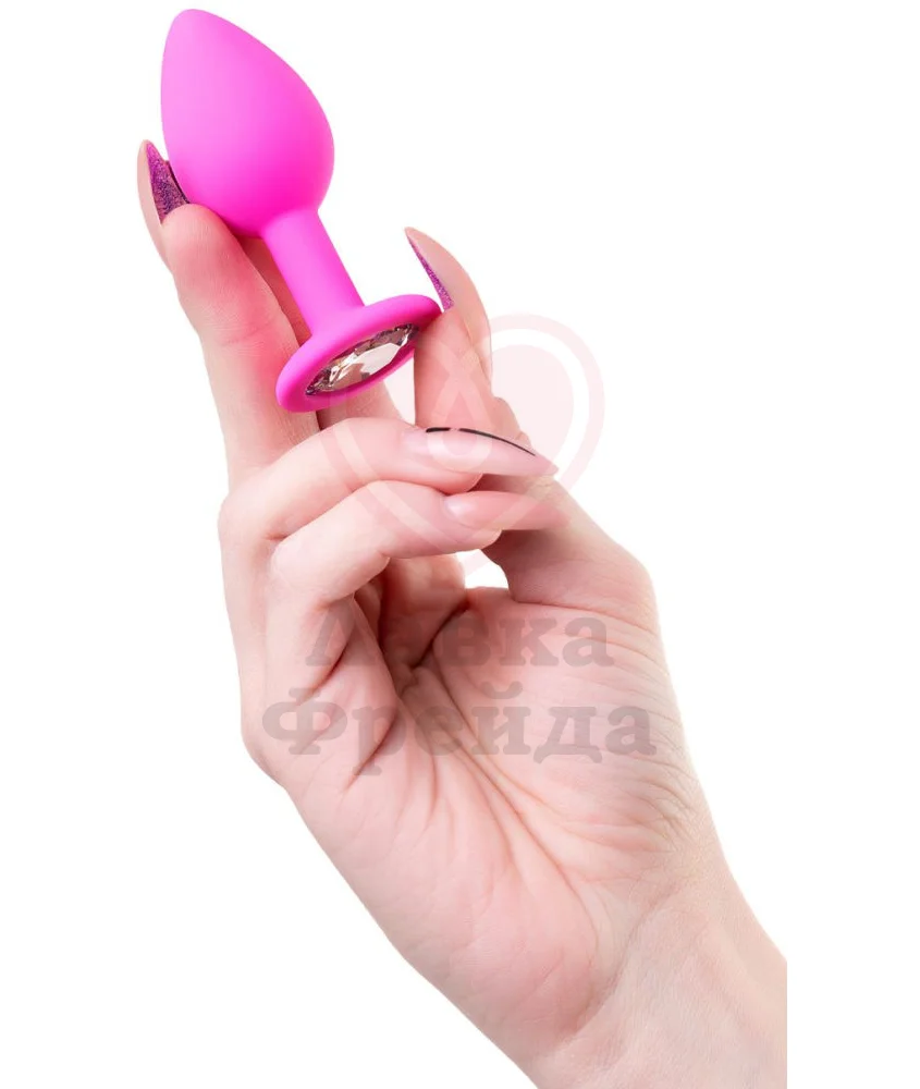 Широкое основание, украшенное сверкающим белым кристаллом, служит гарантией безопасности. Ярко-розовый силикон изделия не вызывает раздражения, легко очищается обычной водой с мылом и антибактериальным спреем для игрушек. Для более приятных ощущений воспользуйтесь лубрикантом на водной основе.