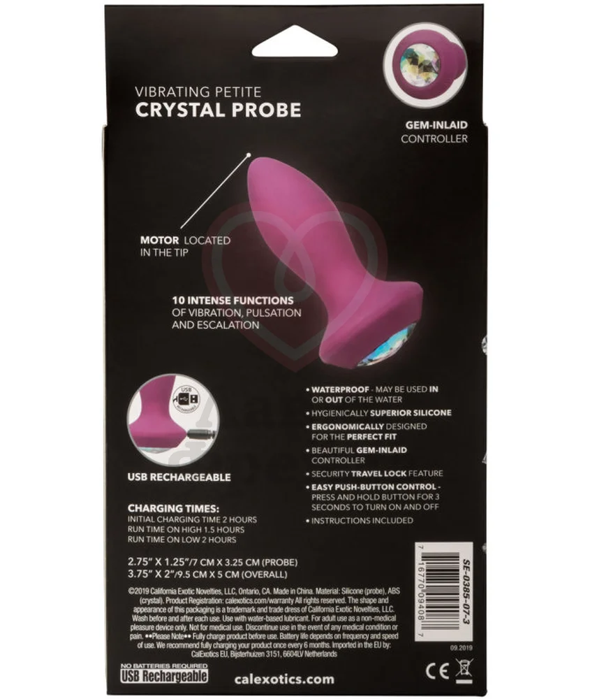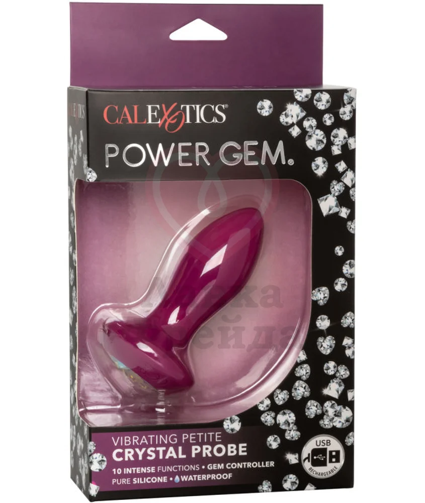 Анальная пробка Power Gem Vibrating Petite Crystal Probe украшена крупным круглым кристаллом на основании, который также является кнопкой управления. Ей можно включать и выключать игрушку, а также переключаться между 10 режимами вибрации. Заряжается через USB кабель - 2 часа полной зарядки обеспечивают до 2 часов непрерывной работы.