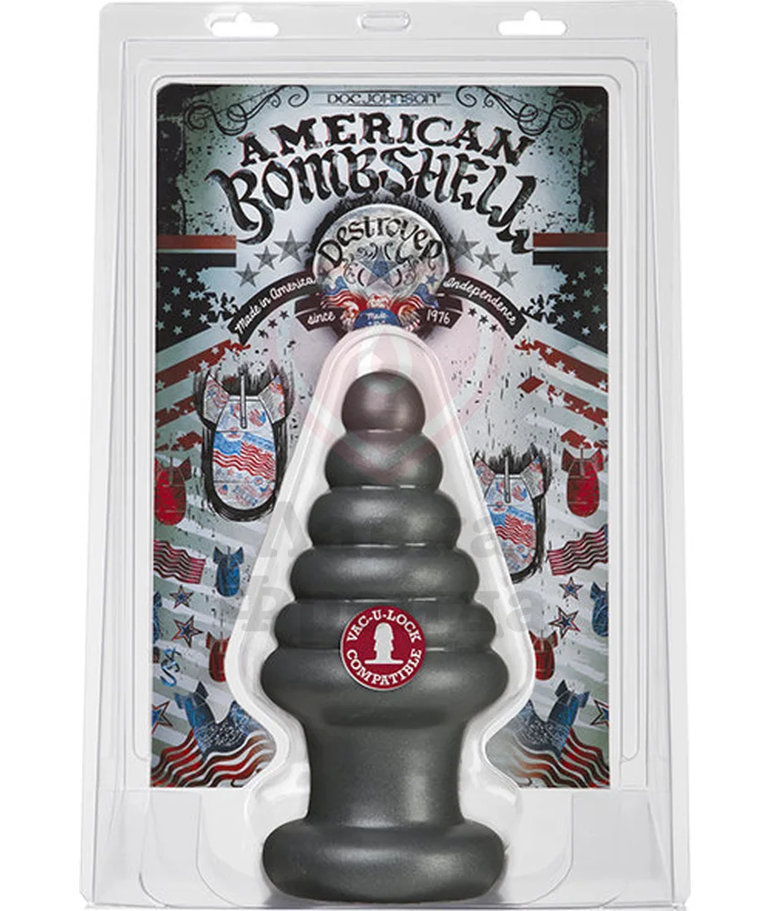 Пробка American Bombshell Destroyer обладает внушительными размерами - длина – 23,5 см, а диаметр – 11 см. Имеет форму елочки с округлым кончиком вначале, плавно расширяющимся корпусом и ограничителем в основании. Серия American Bombshell выполнена из гладкого материала ПВХ серого цвета, с которым можно использовать анальные лубриканты как на водной, так и на силиконовой основе или для фистинга.